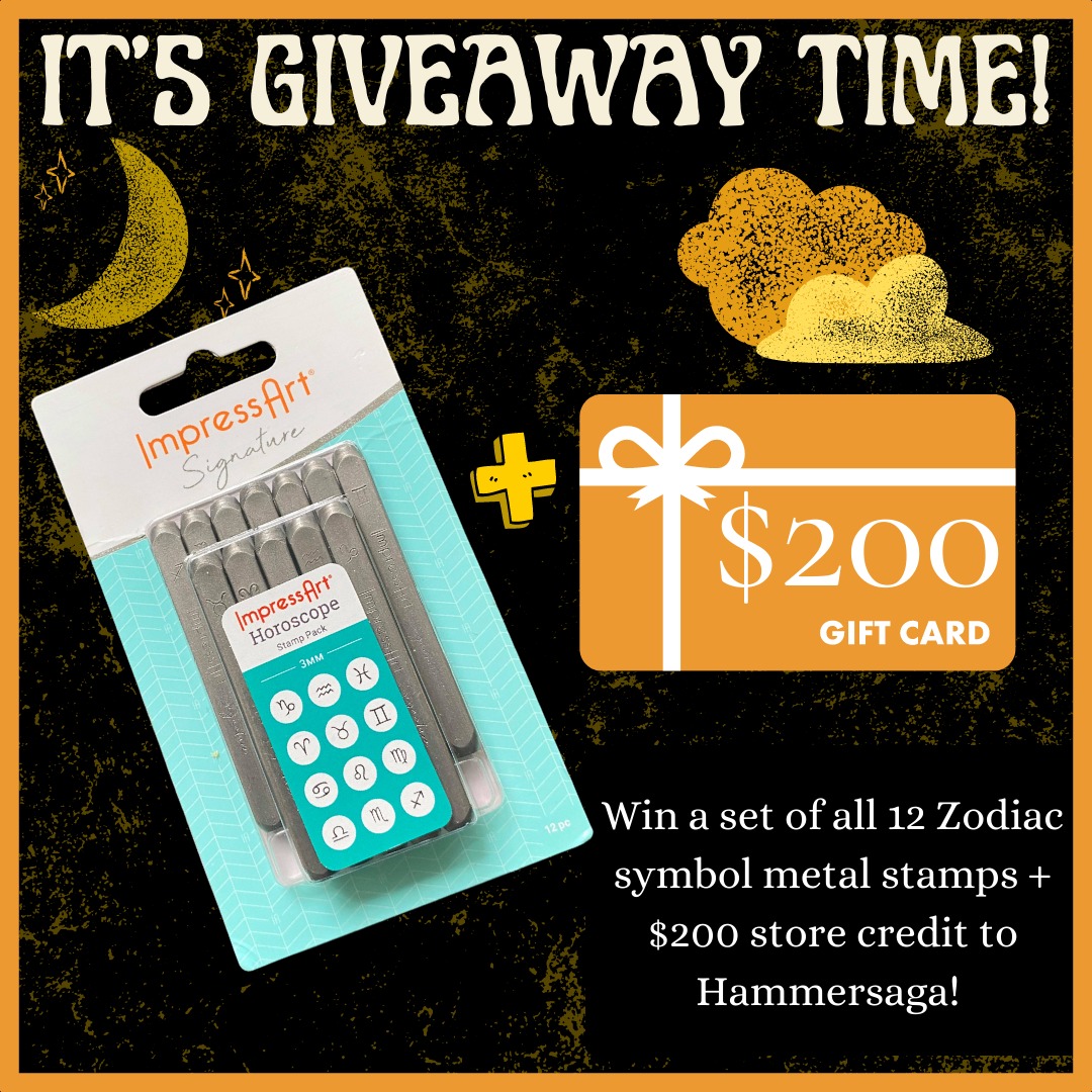 Maximum ARV of all prizes: $230. Prize includes: All 12 Zodiac Symbol metal stamps from Impressart and $200 store credit to Hammersaga.com. If winner is unable to receive payment then prize will be forfeited, and an alternate winner may be selected in accordance with these Official Rules from among the remaining eligible entries for that prize. Prizes may not be transferred or assigned except by Sponsor.