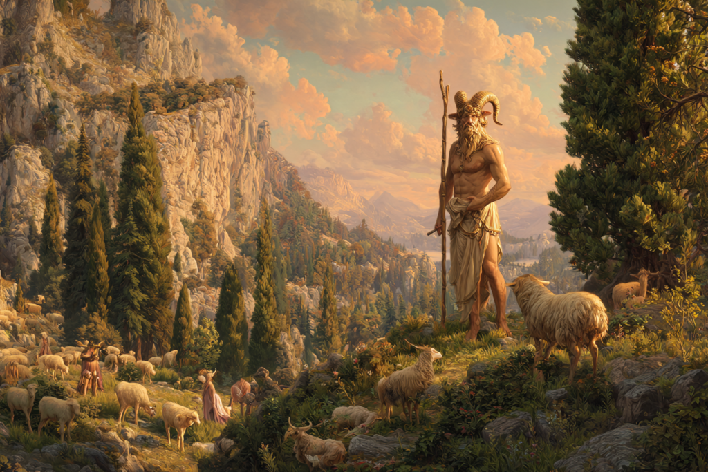 Pan was known as the god of shepherds, protector of flocks, and guardian of lonely places. He wandered the mountains and forests, accompanied by satyrs and nymphs.
