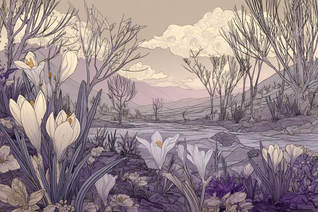 Daffodil, crocus, and iris appear frequently as seasonal markers. Ritual blessing and simple observance reflect themes of new life and rebirth.