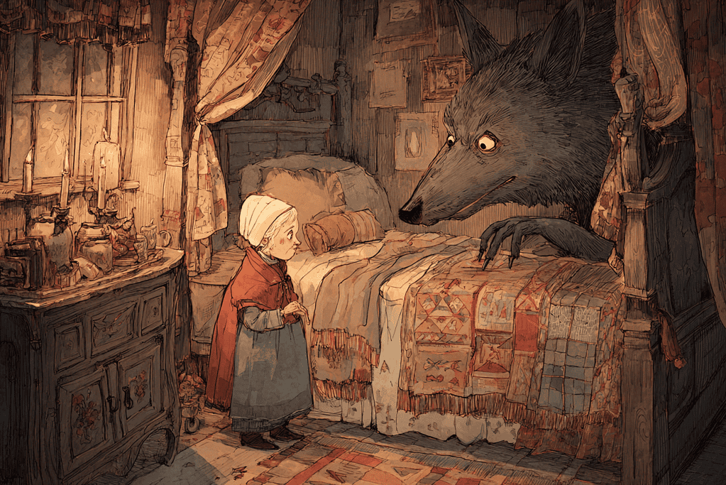 After gaining entry, he cut open the bond of trust, devouring the old woman whole. He then dressed in her nightgown and slipped under the covers.