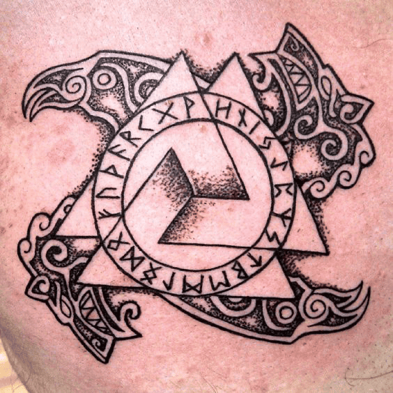 A striking tattoo depicts Huginn and Muninn dynamically encircling a central Valknut symbol, representing Odin’s deep connection to the fallen warriors.