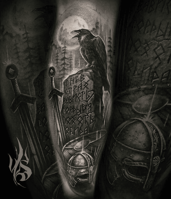 A raven sitting atop a runestone, set against a backdrop of Viking shields and swords, reflecting strength and courage. This tattoo emphasizes the warrior spirit deeply embedded in Norse culture.