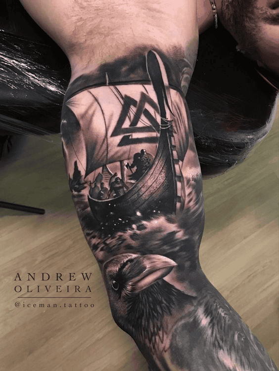 A captivating tattoo sleeve featuring key Norse symbols: Mjöllnir, a Viking sword, a drakkar ship, and the ravens of Odin, all intertwined with a Valknut and the Ginfaxi galdrastafur for protection.