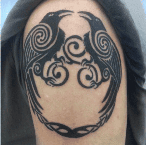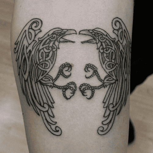 A powerful tattoo showcasing Huginn and Muninn, Odin’s ravens, captured in mid-flight, intertwined with ornate Norse patterns.
