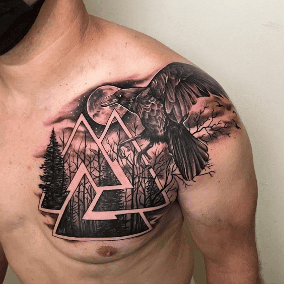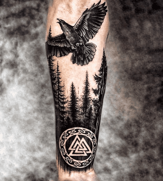 A powerful tattoo showcasing a raven in full flight over a densely wooded forest, underlined by a starkly contrasted Valknut symbol.