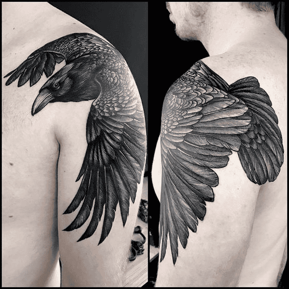An exquisite tattoo of a raven spanning across the shoulder, captured in mid-descent with wings elegantly spread.