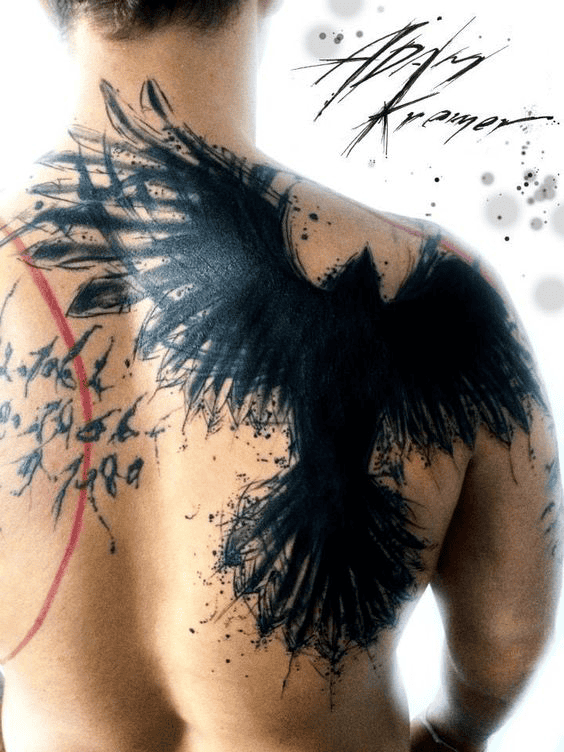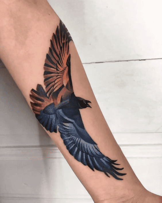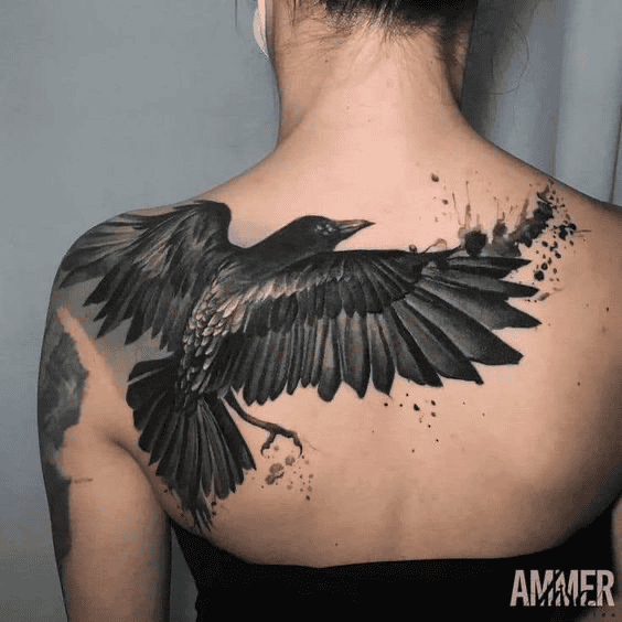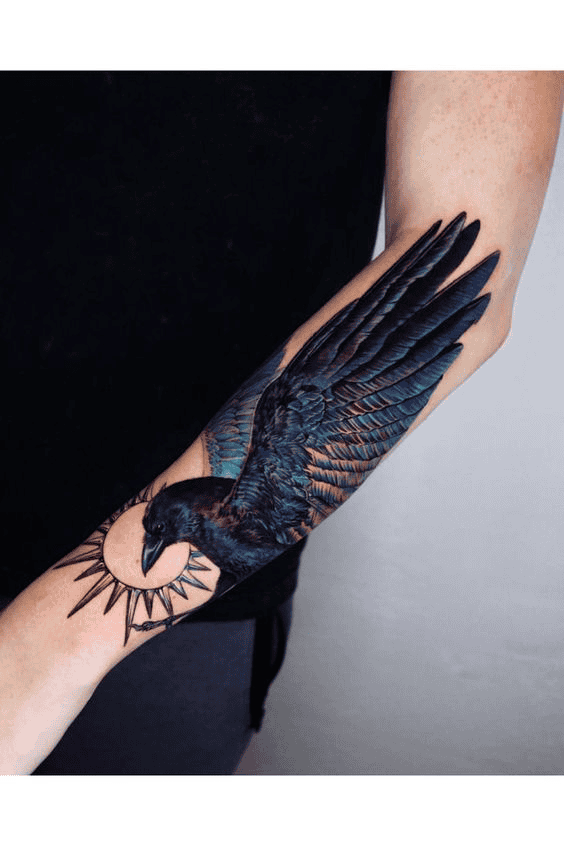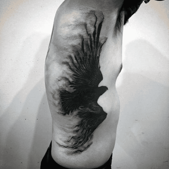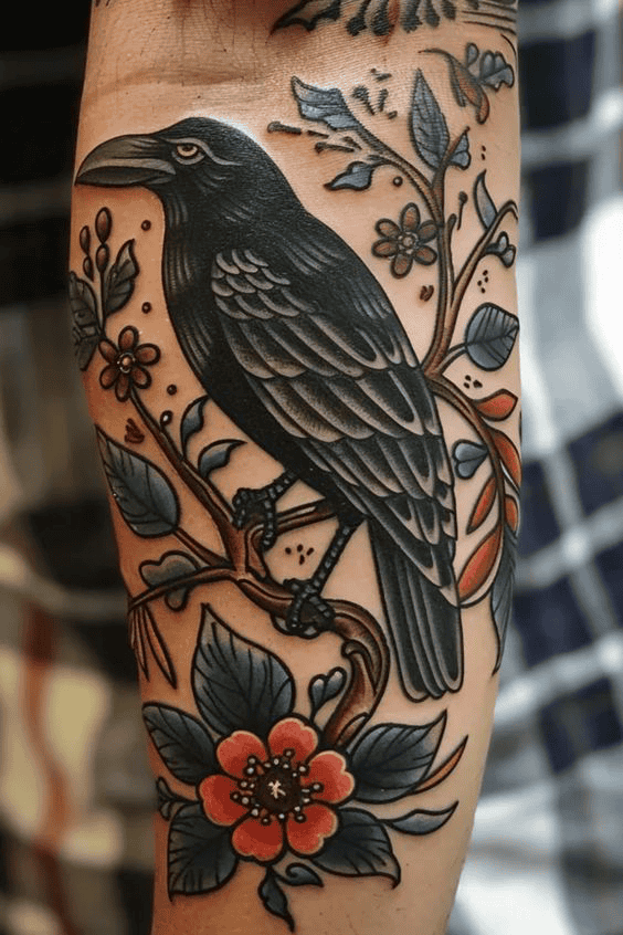 A tattoo where the raven’s feathers transition from deep black at the roots to a fiery red at the tips, symbolizing the transformation and renewal associated with these mythological creatures.