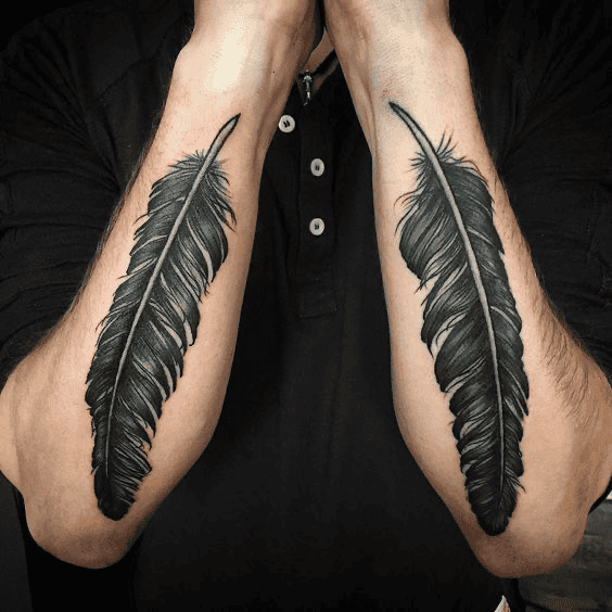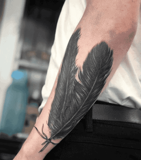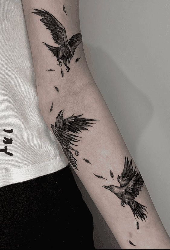 A tattoo that showcases the detailed texture of raven feathers, each plume meticulously inked to reflect realism and depth.