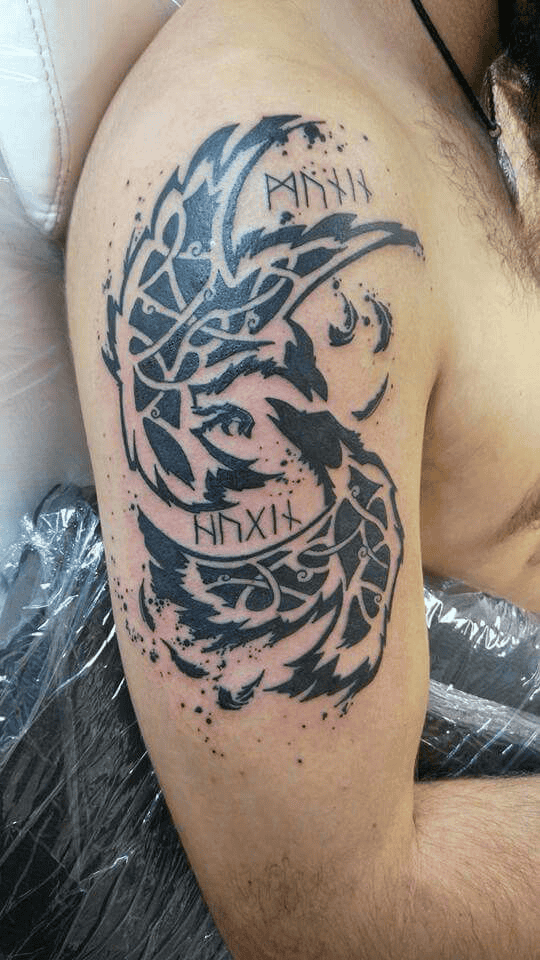 These tattoos often incorporate iconic Norse elements such as runes, the Valknut, and Yggdrasil, framing Huginn and Muninn within a context rich in heritage and mysticism.