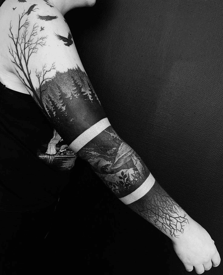 A detailed sleeve tattoo showcases a serene forest landscape with ravens soaring amidst the trees, segmented by striking bands.