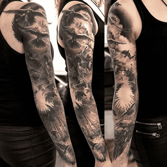 This tattoo spans a wide area, using gradient black shading to depict the sky and harsh landscapes below, capturing the raven’s dominion over the realms.