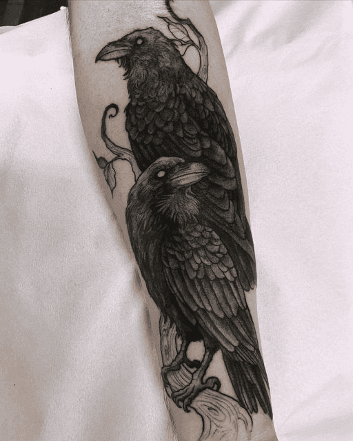 A meticulously crafted tattoo depicting Huginn and Muninn, Odin’s mythical ravens, perched amidst twisted branches.