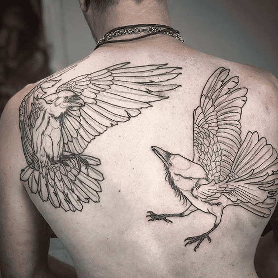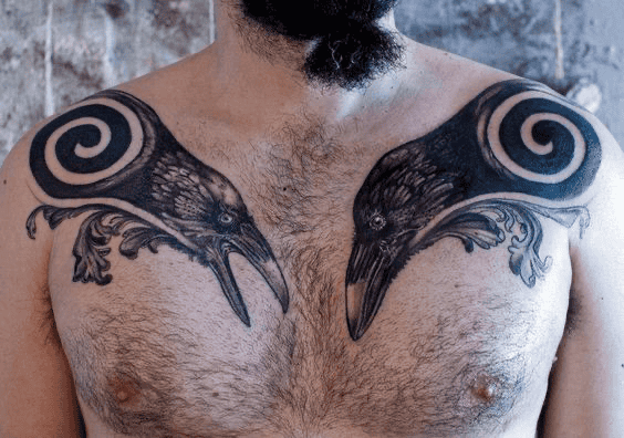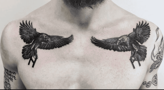 A striking tattoo featuring Huginn and Muninn across the chest, with each raven poised in a dynamic, mirrored pose that converges at the center.