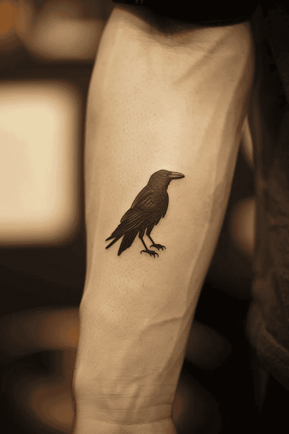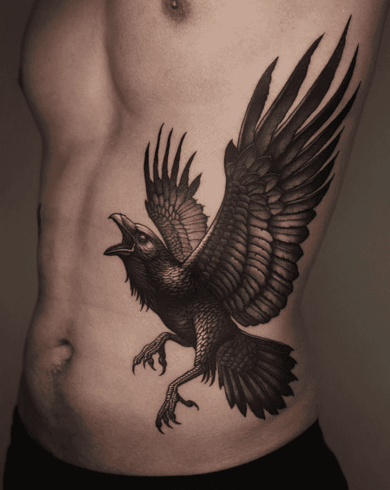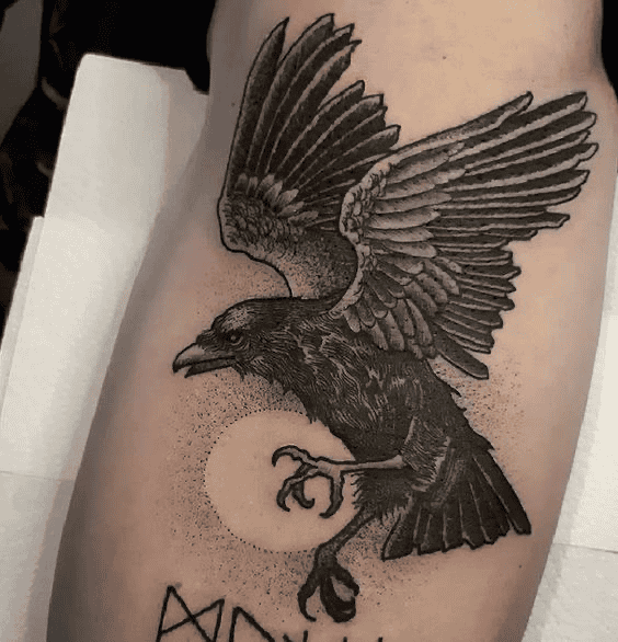 A tattoo that plays with the contrast between light and shadow across the raven’s body, highlighting the complexity of its form.