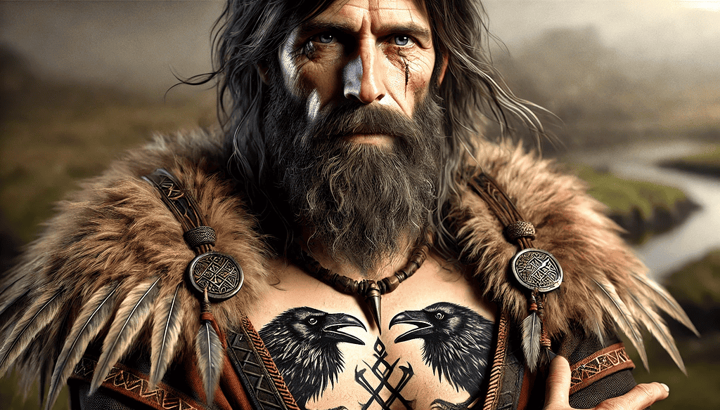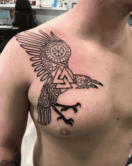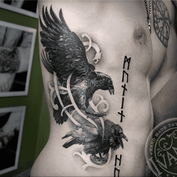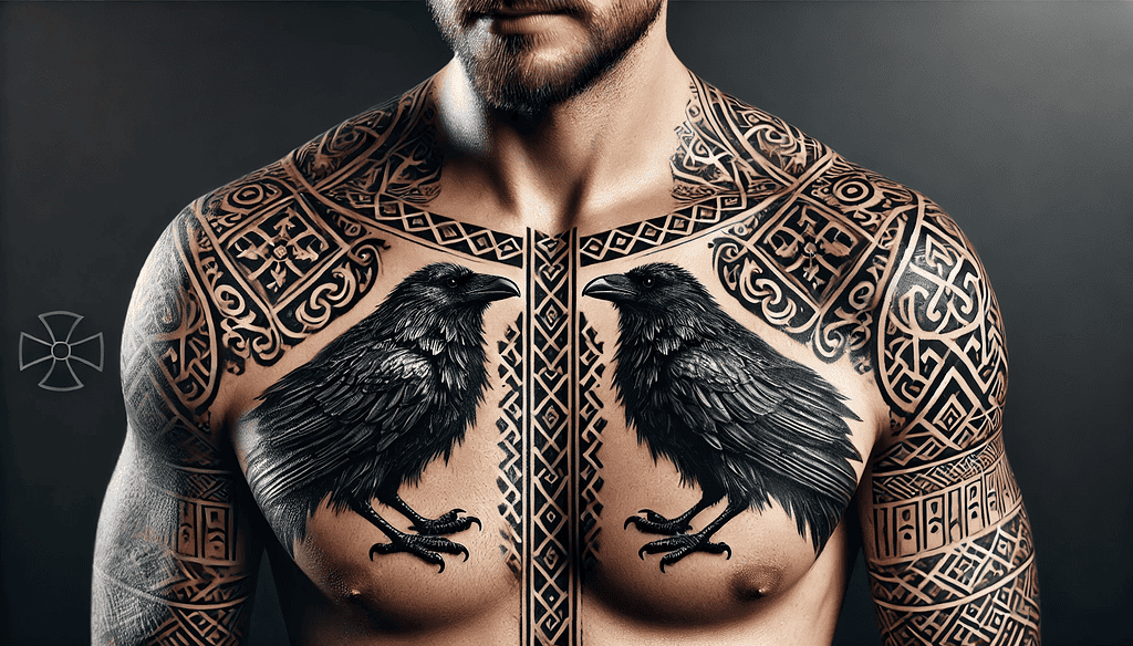 A powerful tattoo across the chest features Huginn and Muninn in mid-flight, each clutching a significant rune—Hagalaz and Mannaz, the first letters of their respective names in the Elder Futhark.