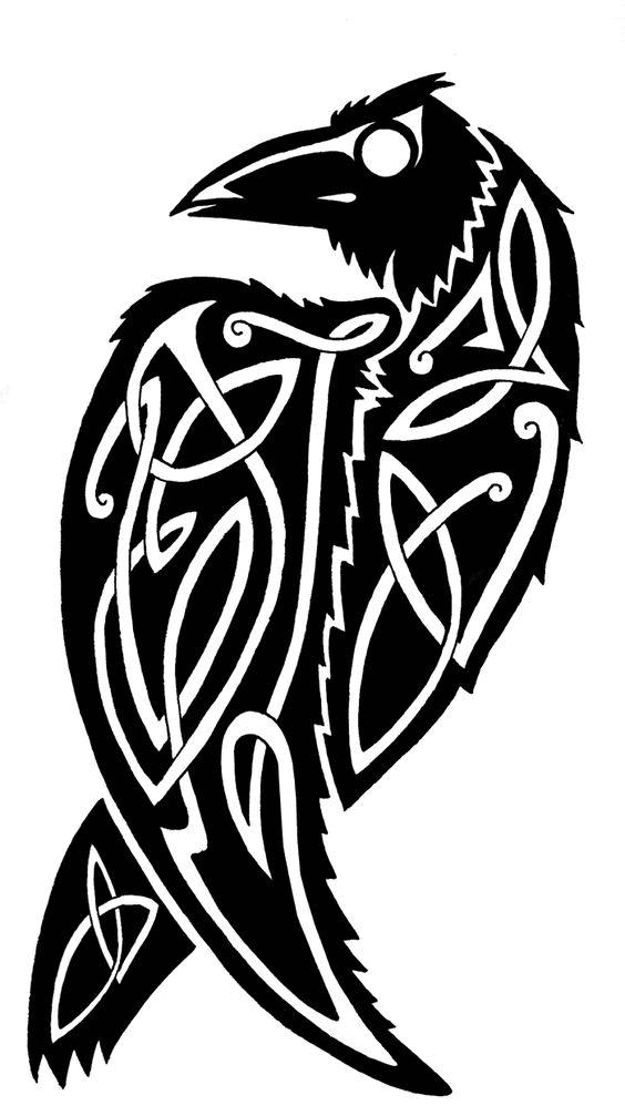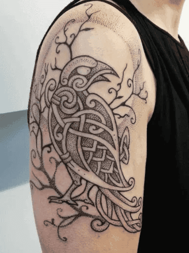 A tattoo featuring a stylized raven, intricately designed with Celtic knotwork.