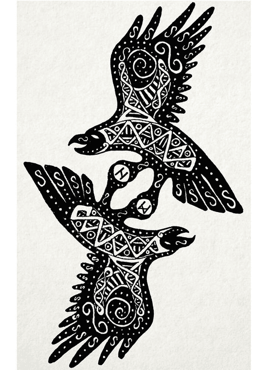 This style, which makes dramatic use of negative space and pure black ink, captures the mystical and ominous qualities of Huginn and Muninn, enhancing their symbolism in Norse mythology.