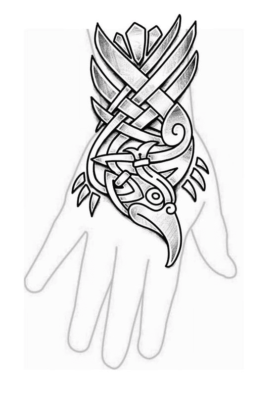 A striking tattoo design of a Urnes-style raven gracefully adorning the hand and wrist.