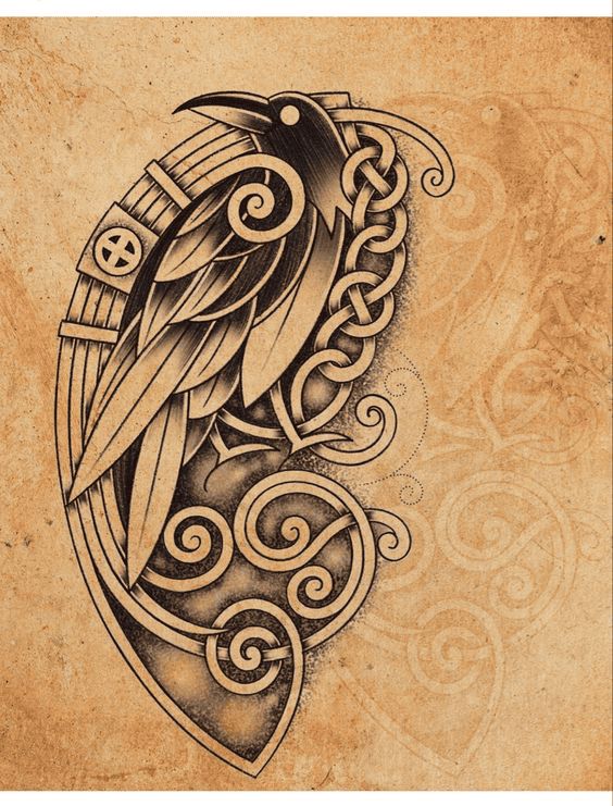 A tattoo design featuring a stylized raven with intertwined Celtic knots, symbolizing the deep connection and spiritual guidance within Norse mythology.
