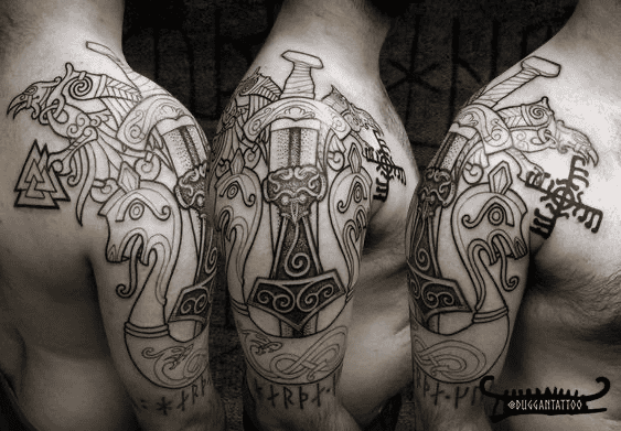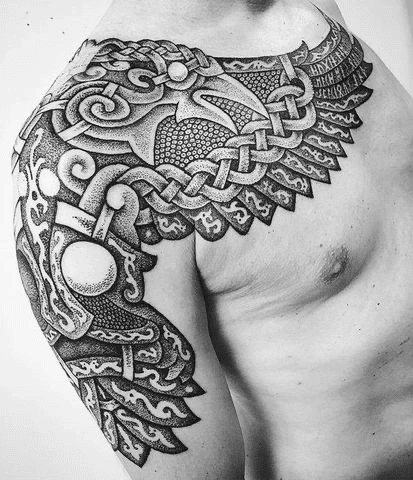 An ornate tattoo featuring intricate Celtic knotwork entwined with Norse artistry, elegantly covering the shoulder.