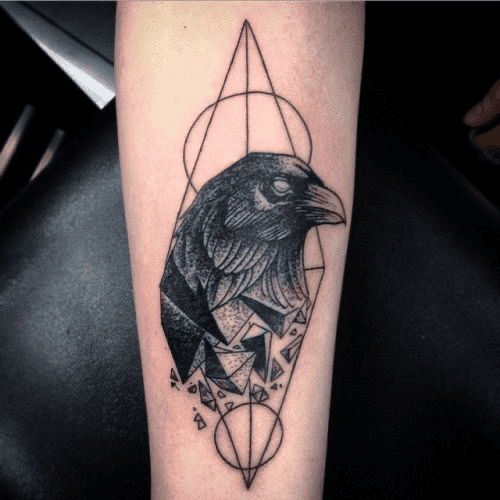 Muninn is presented in a geometric bind rune style with sharp angles and intersecting lines. The precision of the blackwork emphasizes the structural beauty of the raven, marrying modern artistry with ancient symbolism.
