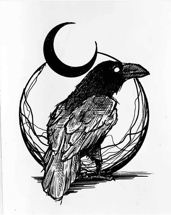 Capturing the dynamic motion of flight, this design uses fine lines to depict the raven’s feathers ruffling against the wind.
