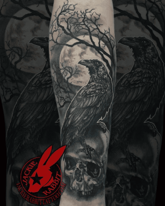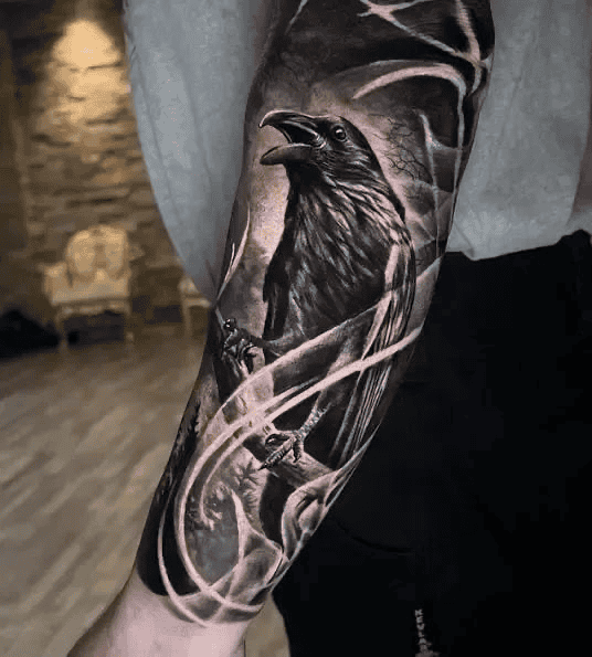 Utilizing advanced shading techniques, this tattoo gives the raven a three-dimensional appearance, making it seem as though it could leap off the skin.