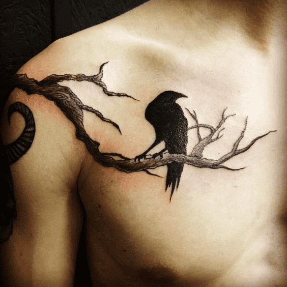 Featuring a raven perched on a branch, this design includes detailed bark textures and the subtle interplay of the raven’s claws gripping the wood.