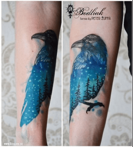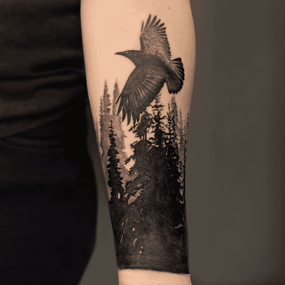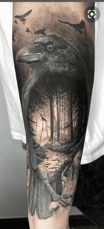 A stunning tattoo featuring a raven superimposed over a haunting forest scene, creating a deep visual narrative.