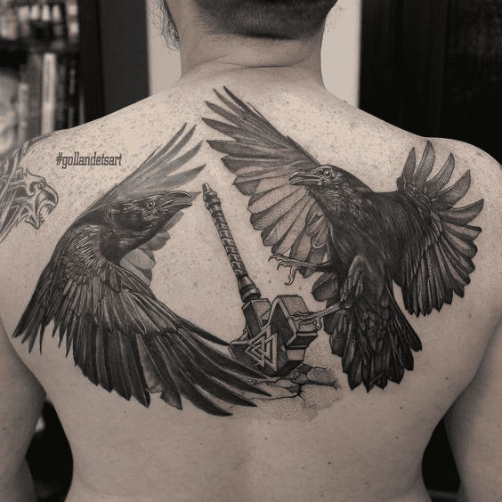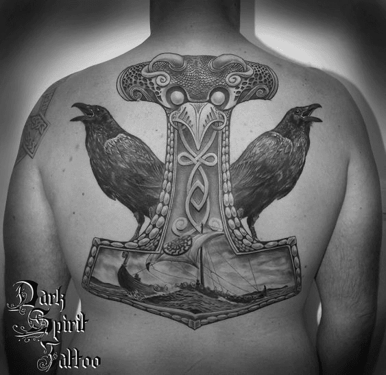 A majestic tattoo featuring Huginn and Muninn flanking a large Mjolnir, which houses a Viking longship scene.