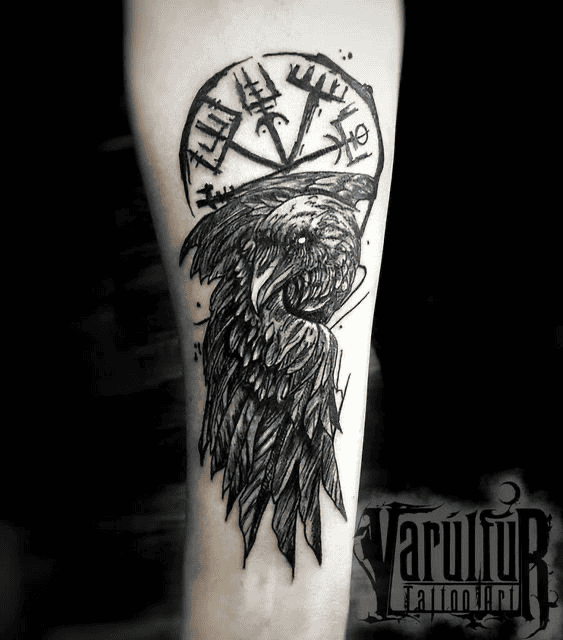 A striking tattoo depicting a raven with a partial Vegvisir in the backdrop, symbolizing guidance and protection.