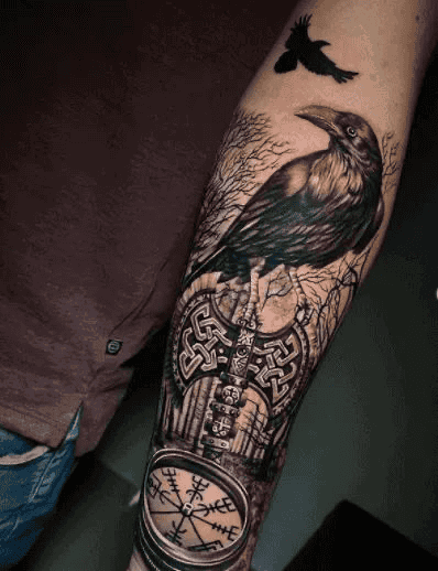 A mesmerizing tattoo that features a raven perched on a Viking battle axe, with a Vegvisir symbol below, set against a backdrop of a forest.