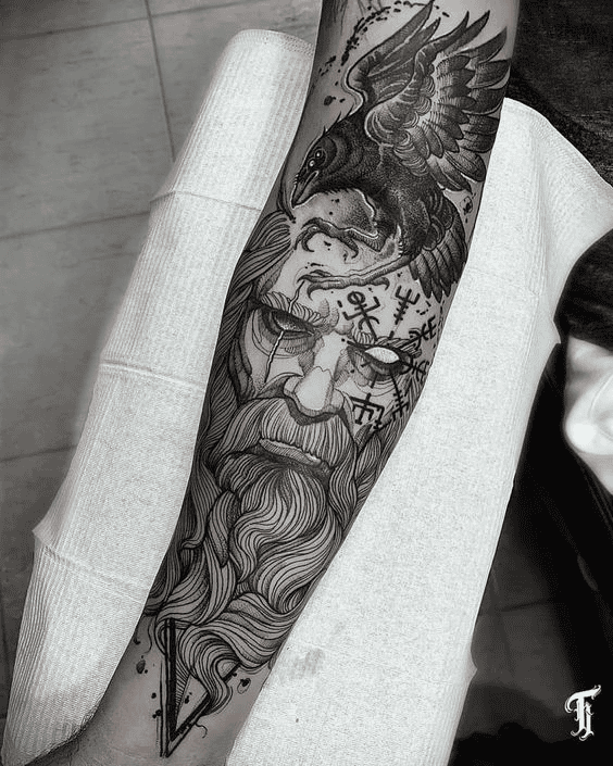 A striking tattoo of Odin, adorned with detailed features and a Vegvisir symbol over his left eye, accompanied by a raven symbolizing his deep connection to wisdom and the spiritual world.