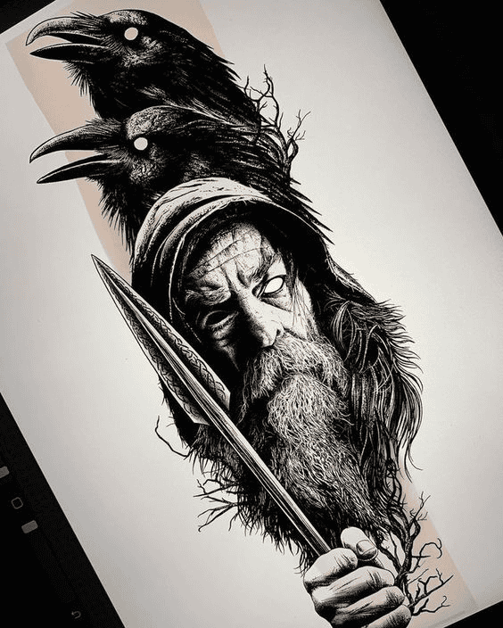 This artwork masterfully integrates traditional symbolism to represent wisdom and transformation in Norse mythology.