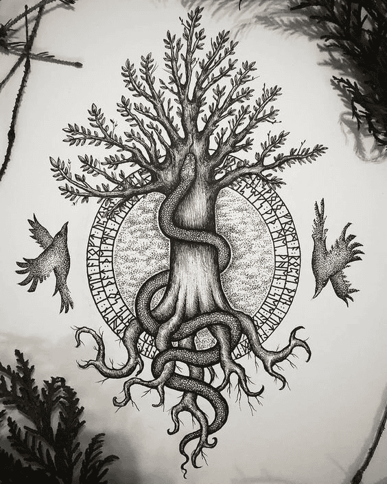A design depicting Yggdrasil, the World Tree, entwined with the Midgard Serpent, set within a runic circle.