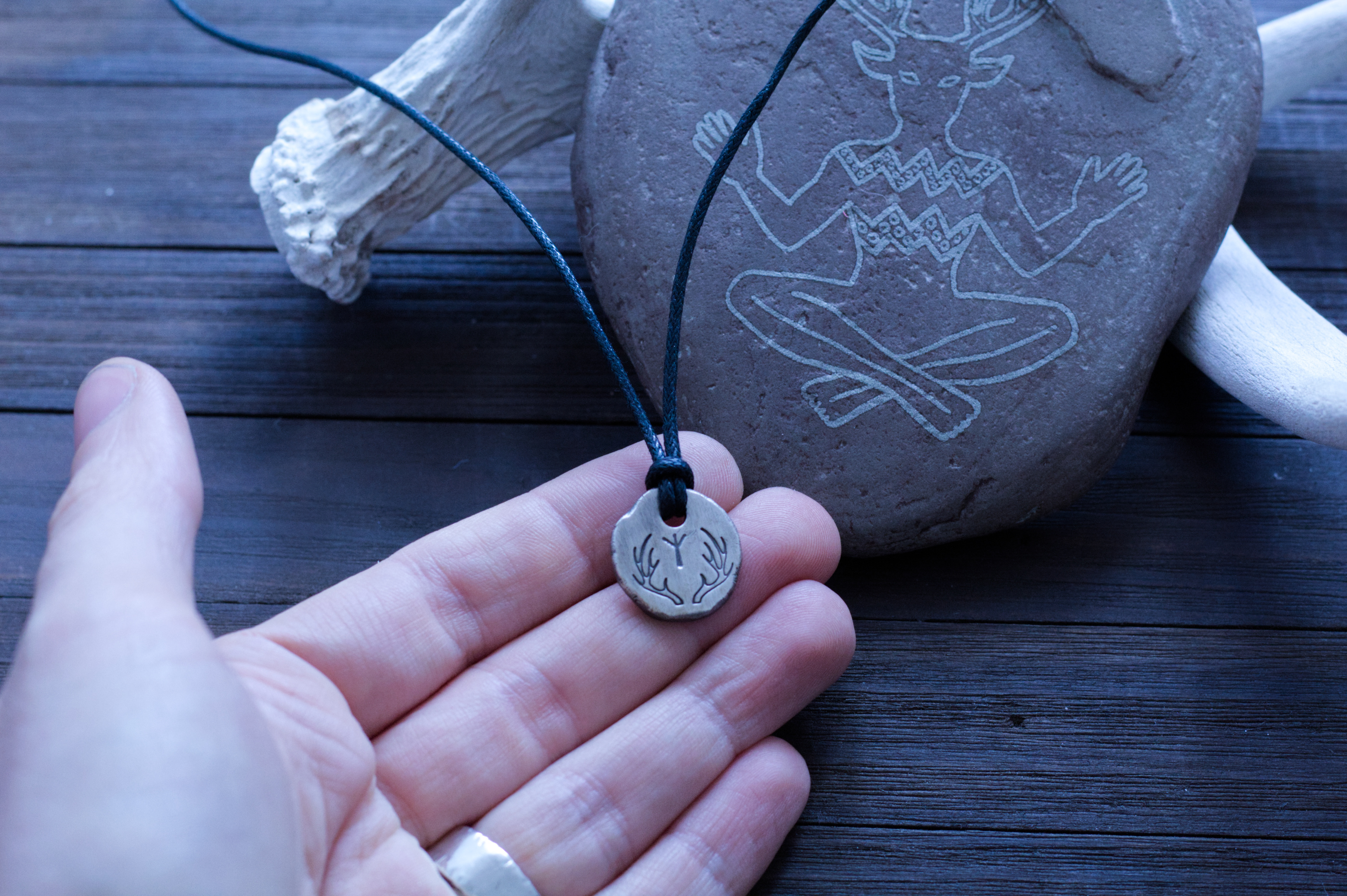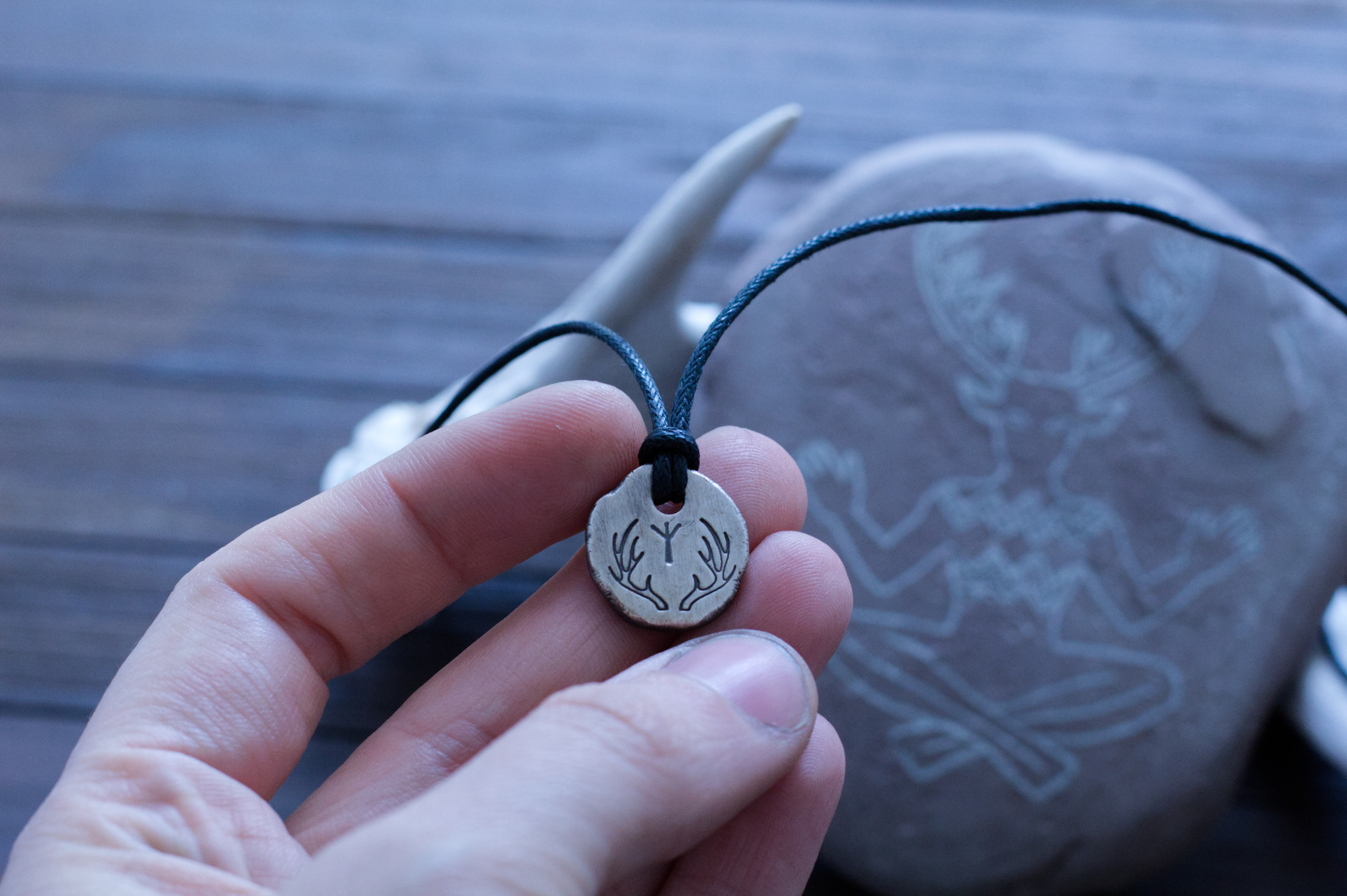This Rune pendant is expertly handcrafted in fine silver with the Elder Futhark Rune of your choice which is encircled with deer antler. Pendant rests on a black cotton cord.