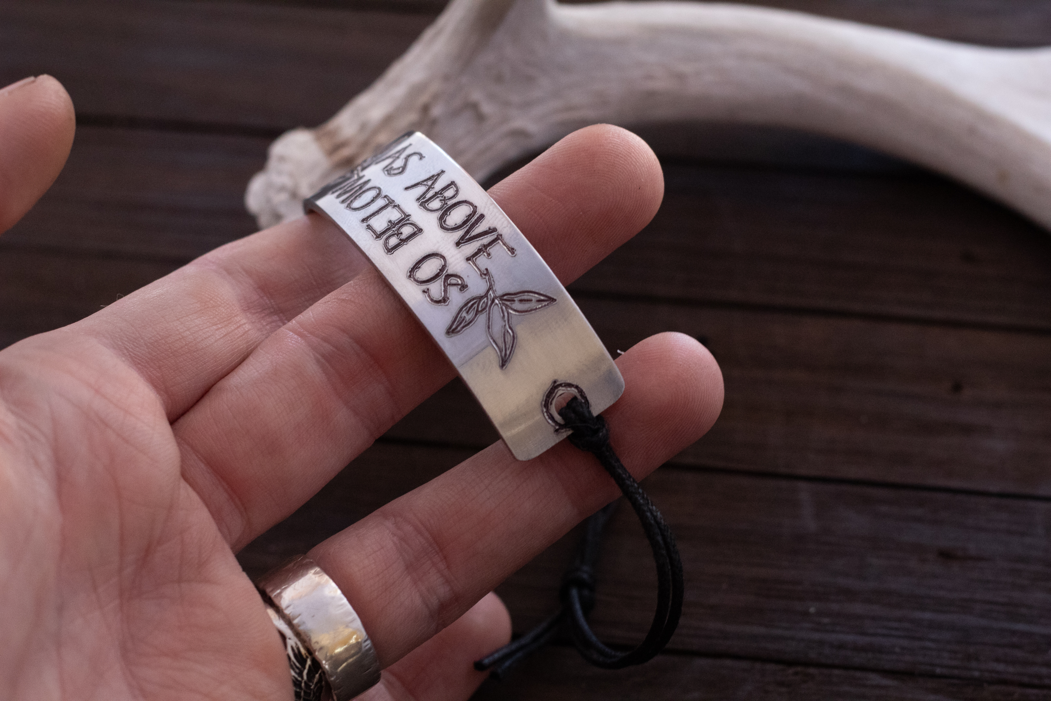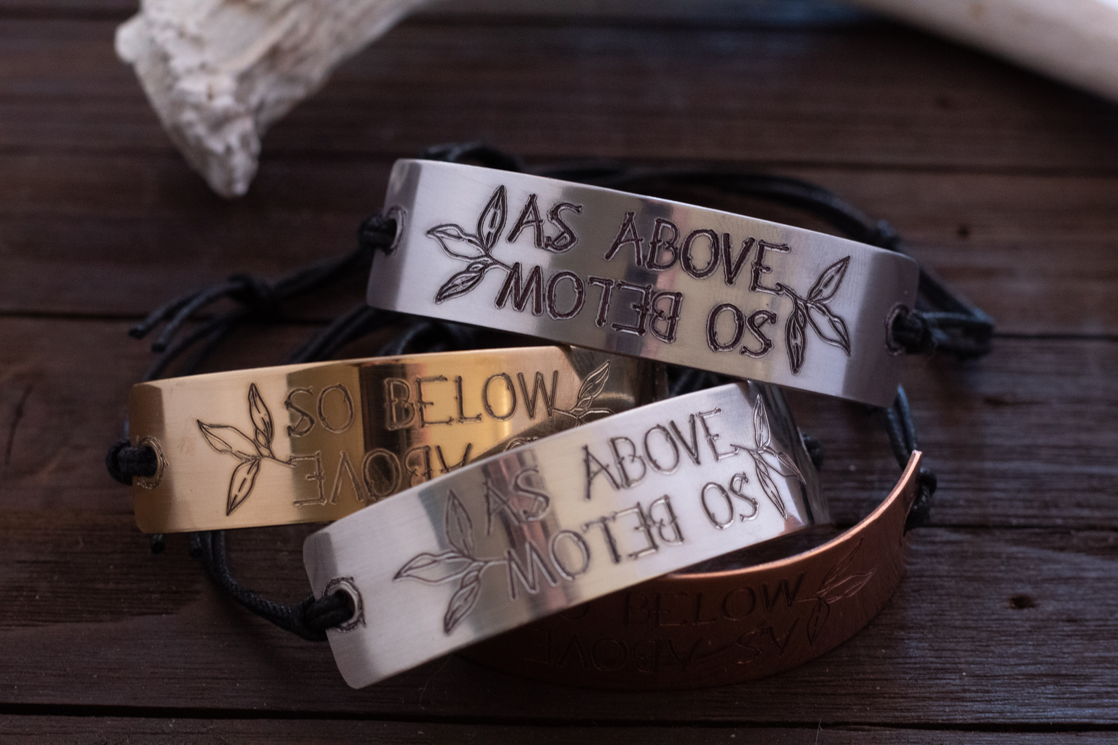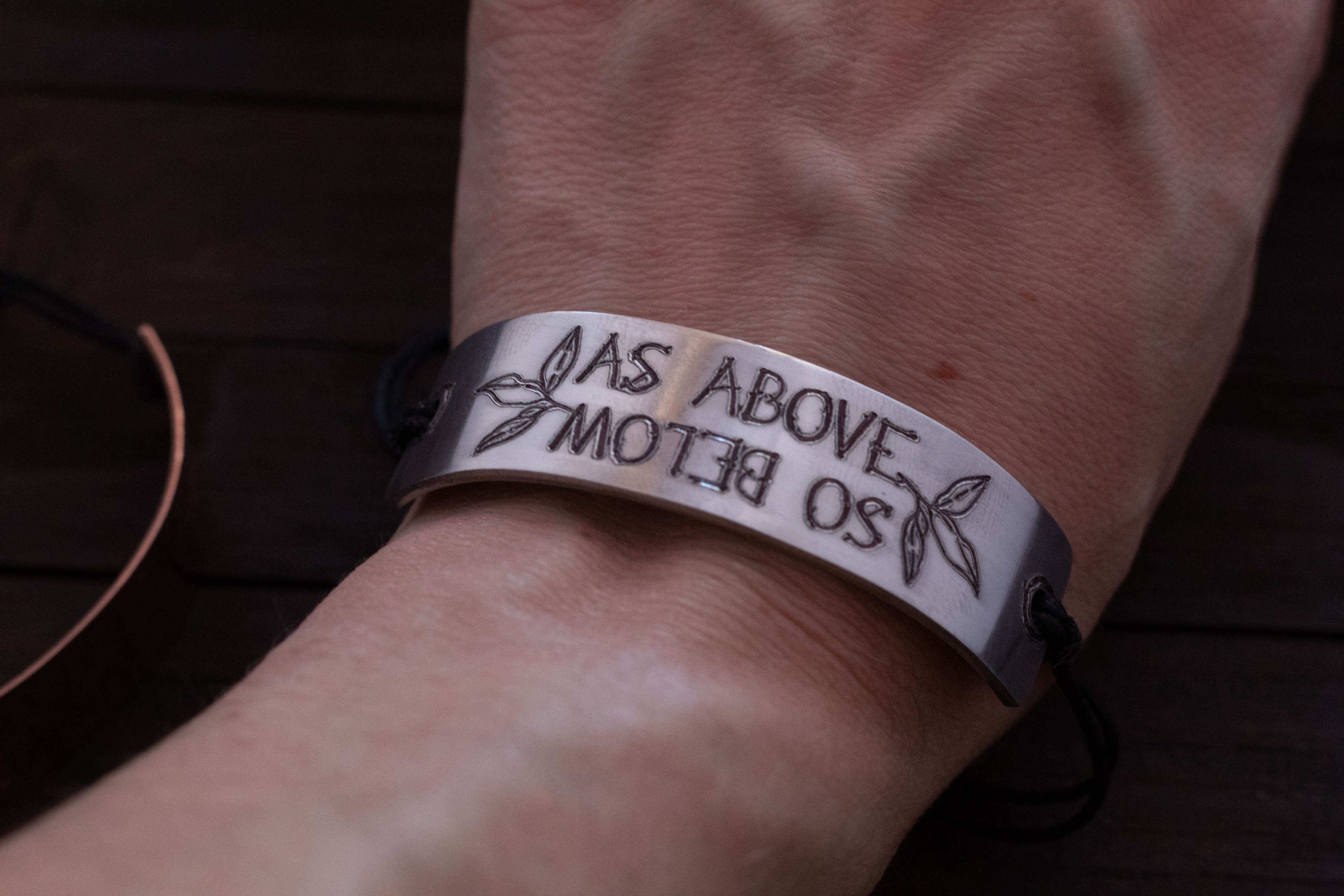Handcrafted As Above, So Below bracelet in your choice of either Fine Silver, Copper, Brass or Aluminum. This is a sliding knot bracelet and will fit wrists between 4 inches to 9 inches. To adjust this bracelet, slide the knots on each side.