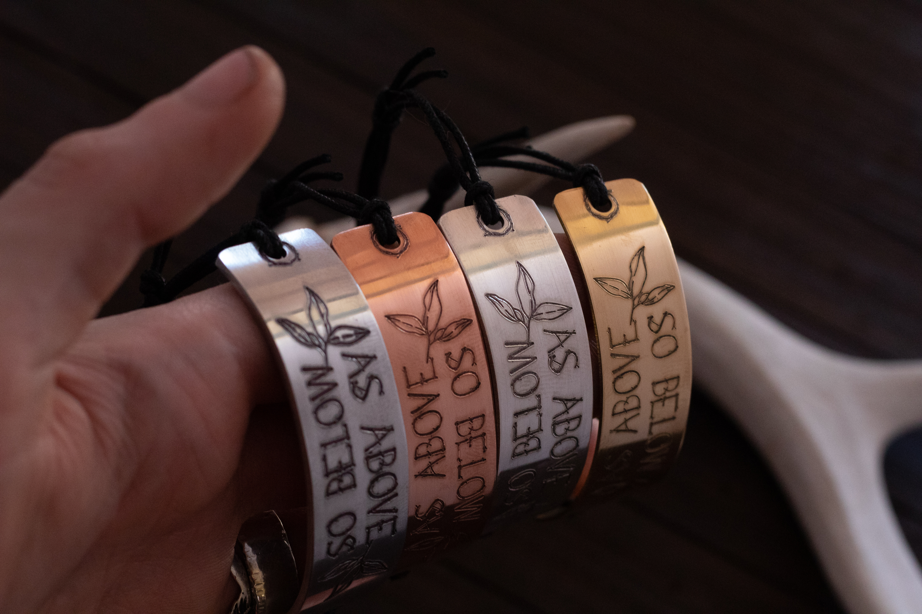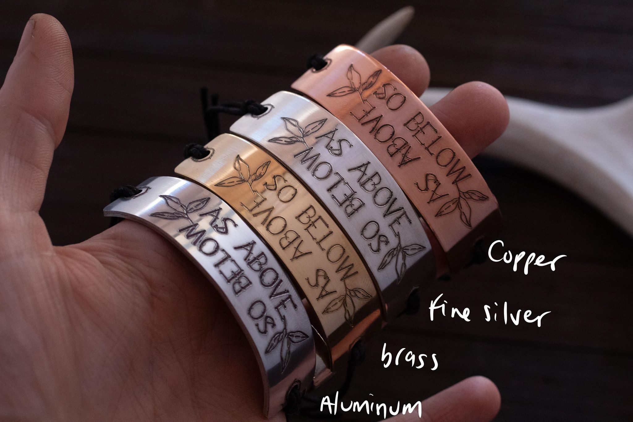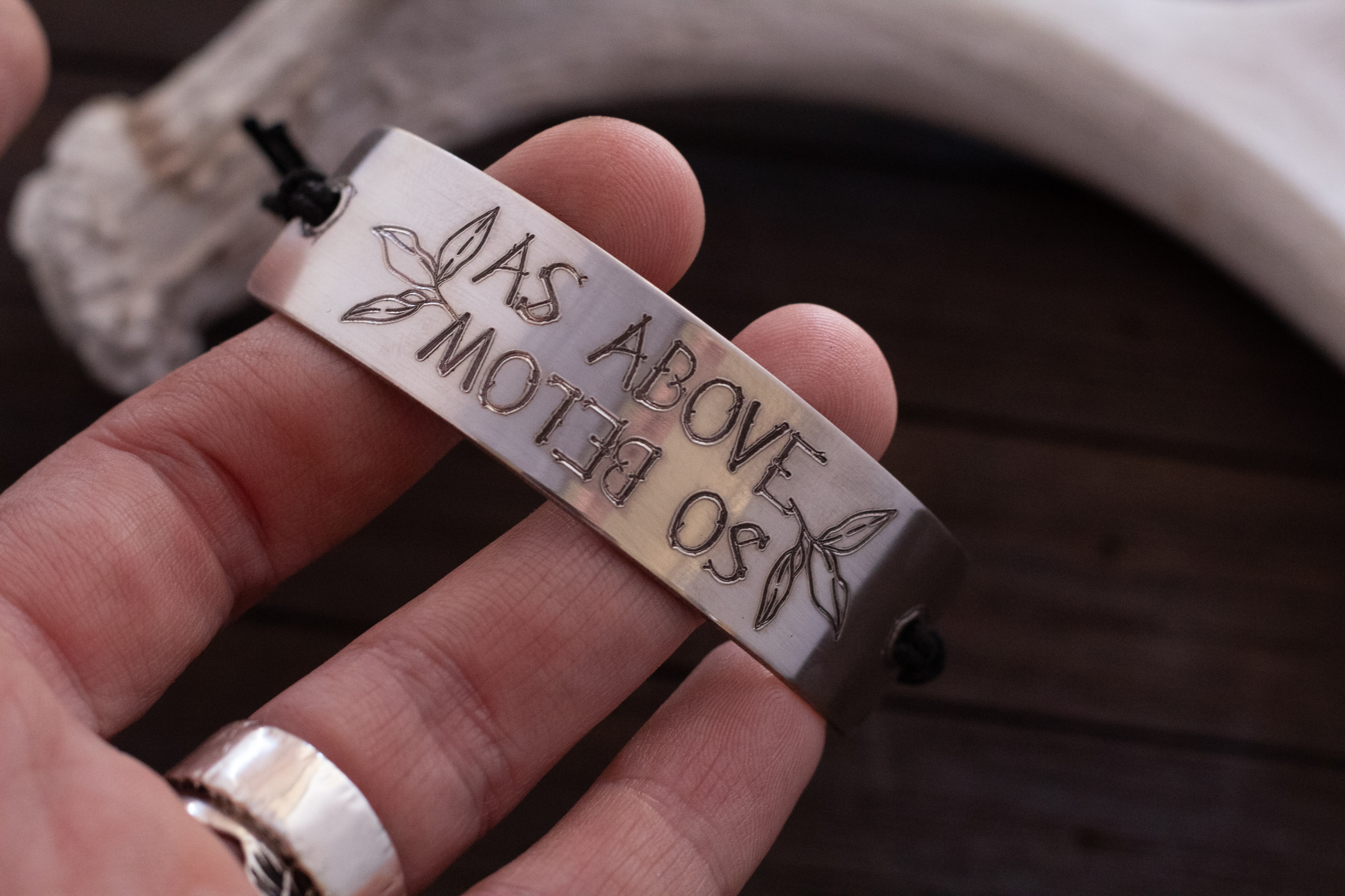 Handcrafted As Above, So Below bracelet in your choice of either Fine Silver, Copper, Brass or Aluminum. This is a sliding knot bracelet and will fit wrists between 4 inches to 9 inches. To adjust this bracelet, slide the knots on each side.