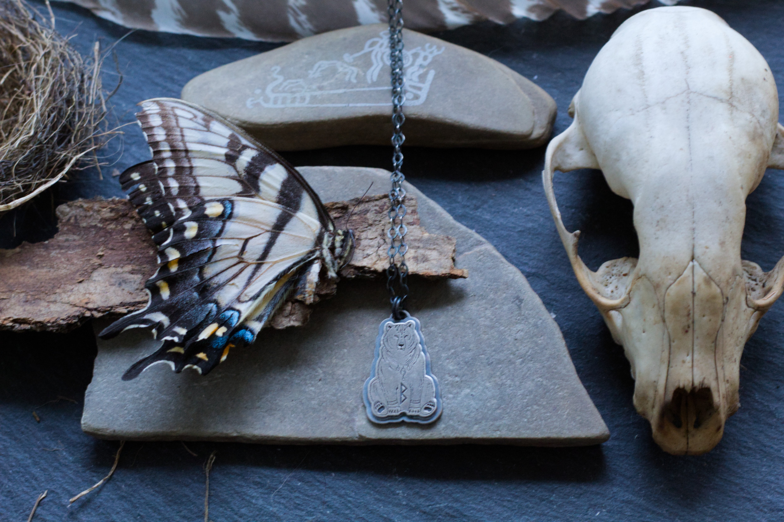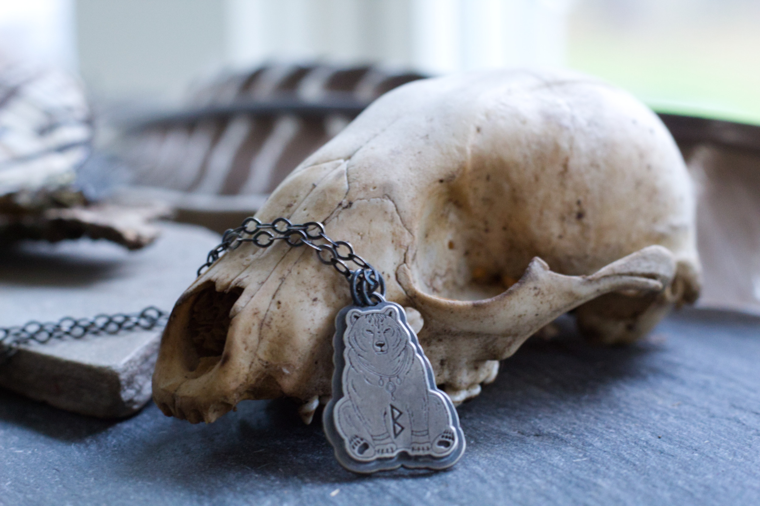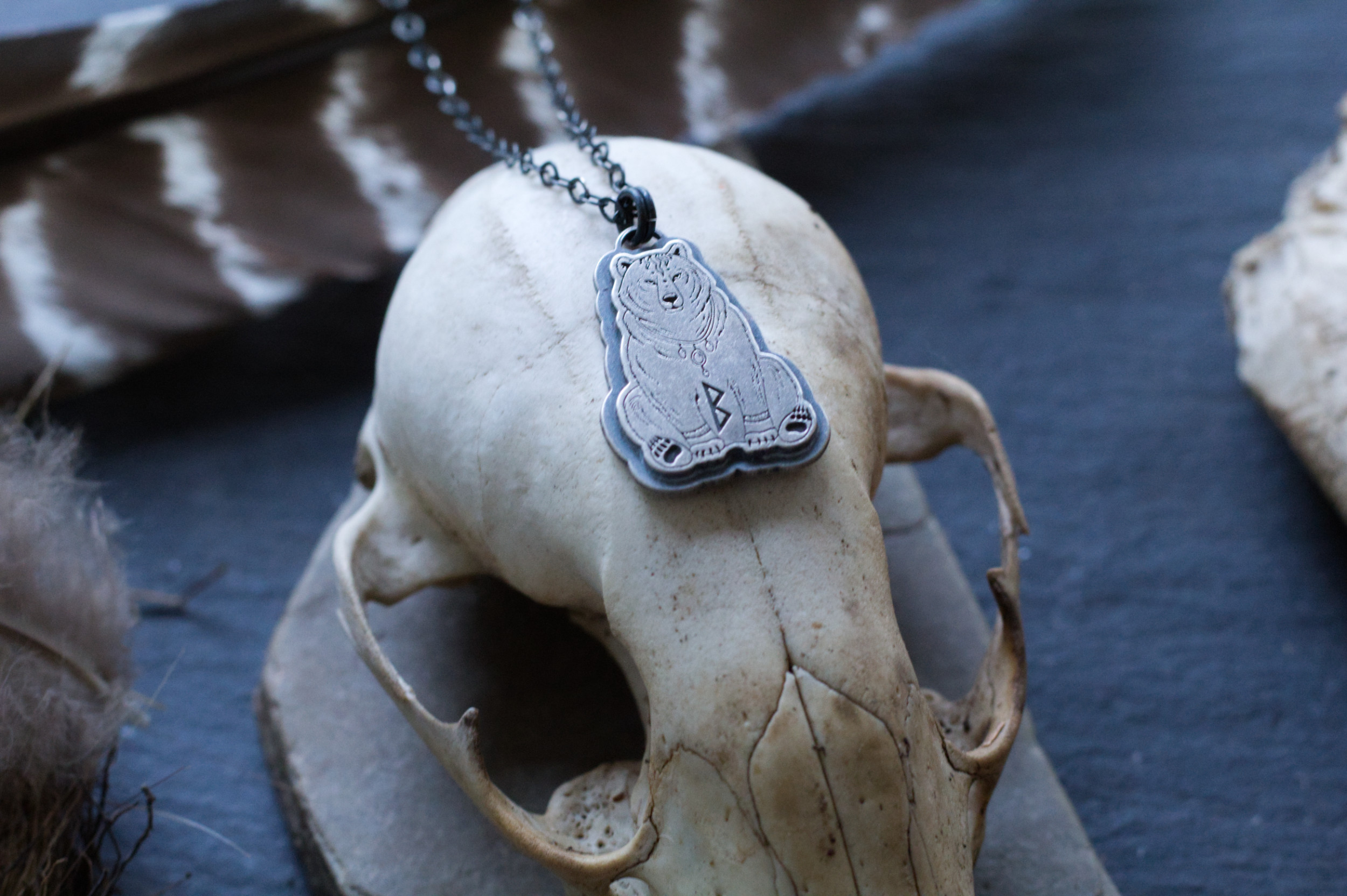 Here I present to you, the great mother, a pendant for women’s (or men, its a two way road after all) fertility. The shaman-esque bear features the Elder Futhark Rune, Berkano, which symbolizes womens fertility, birth and the womb.