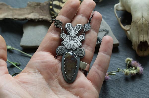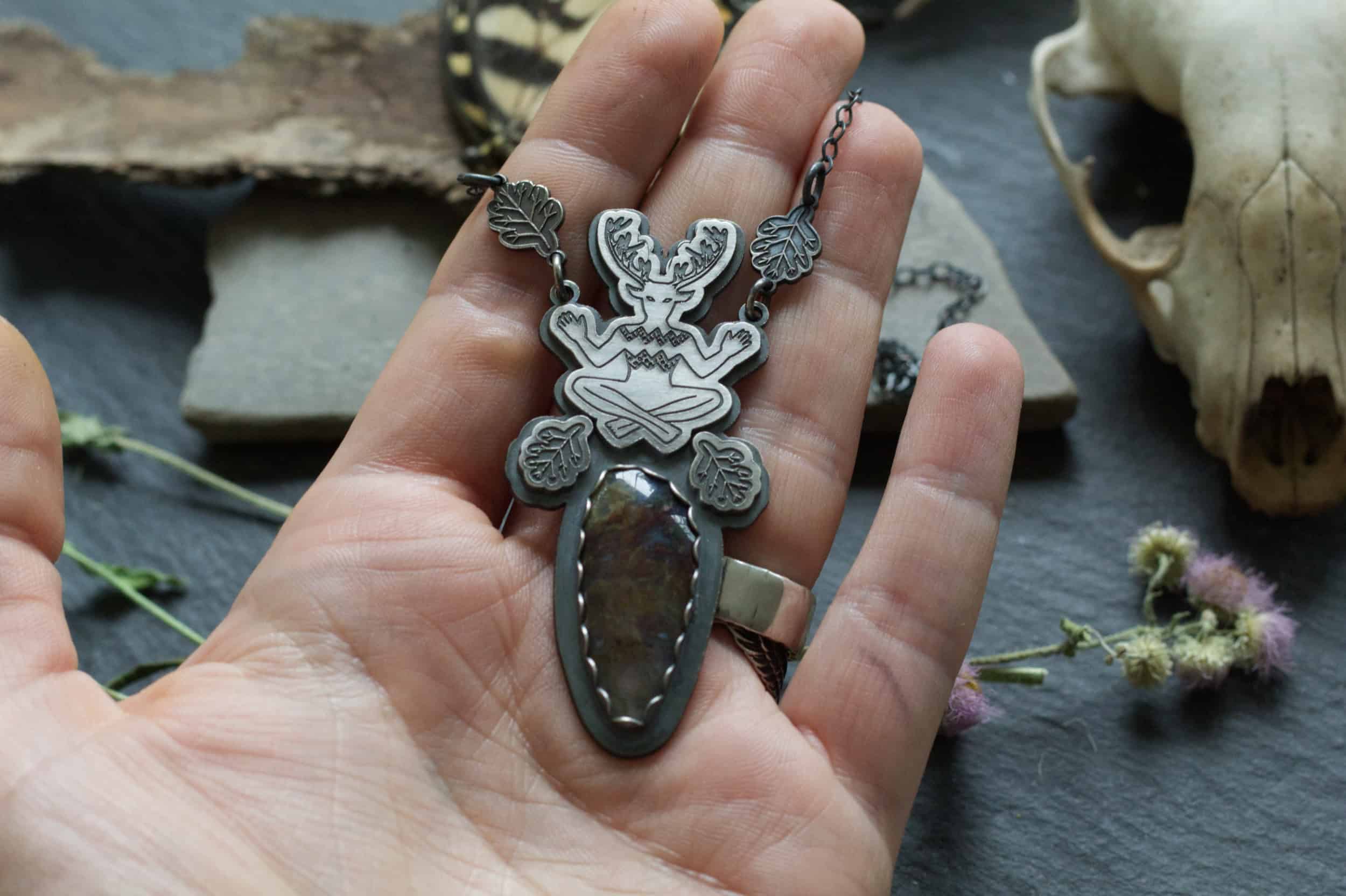 Paired with Moss Agate that you can see through, Cernunnos sits atop this gorgeous cabochon with oak leaves at his side in 4 corners.