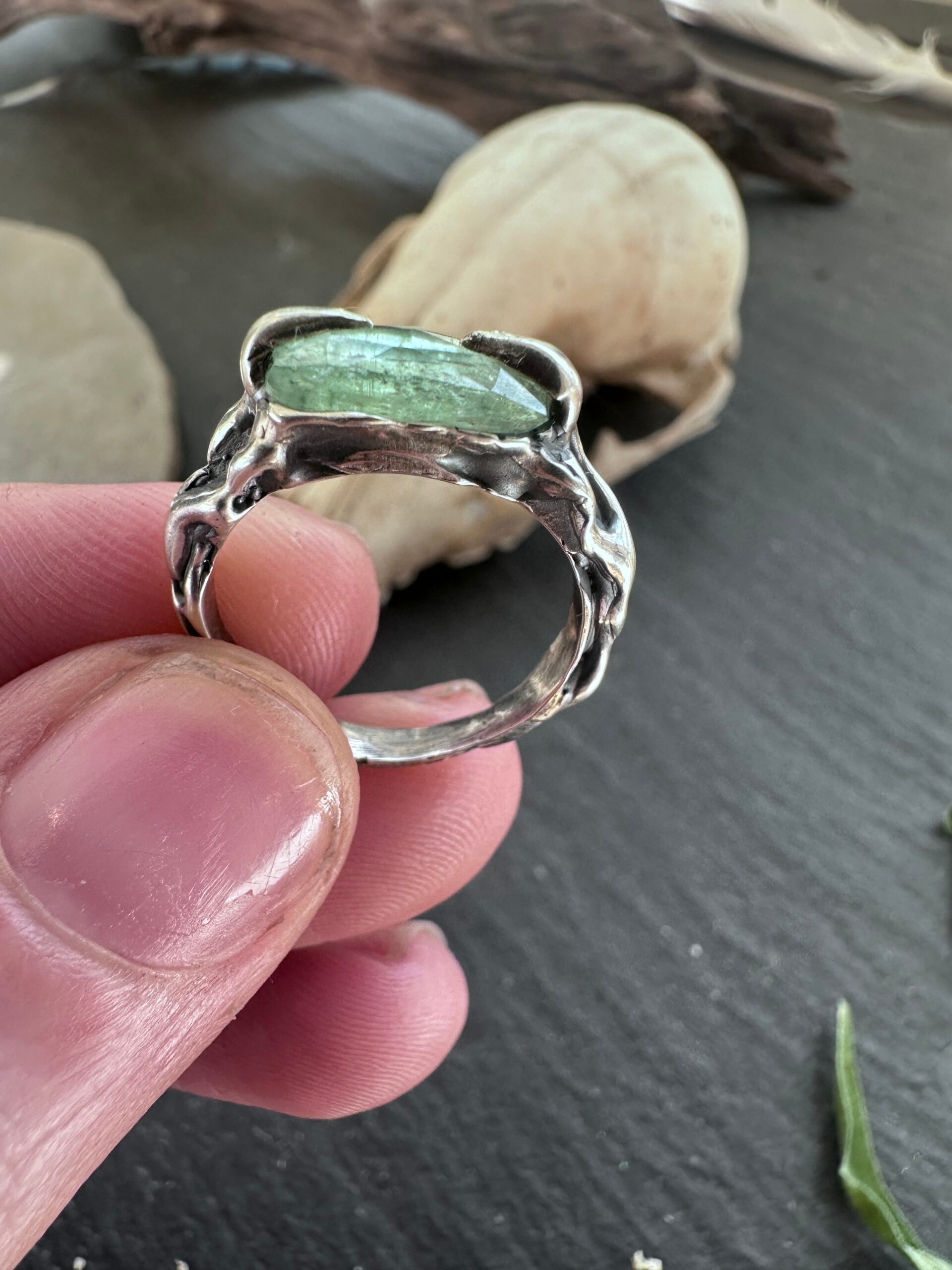 Twisting strands of sterling silver curl around a raw-cut green kyanite, cradling it like living vines.