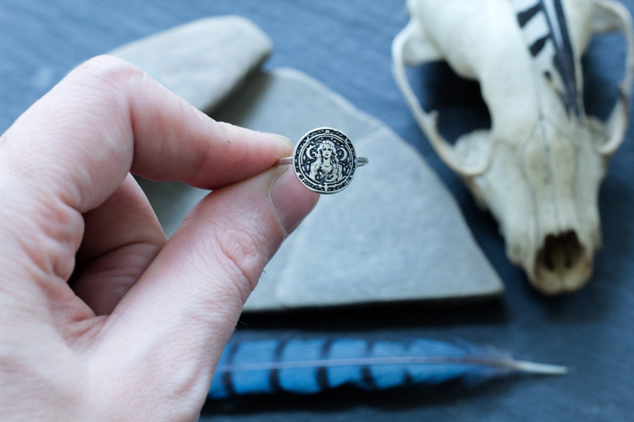 Dainty and minimal, my smallest Goddess Hecate ring yet. This ring showcases the goddess in the stars, in between two crescent moons and is fully handcrafted in your choice of either fine silver, copper or brass on a sterling silver ring base. The disc itself features a slight curve for comfort and better forming to the finger.