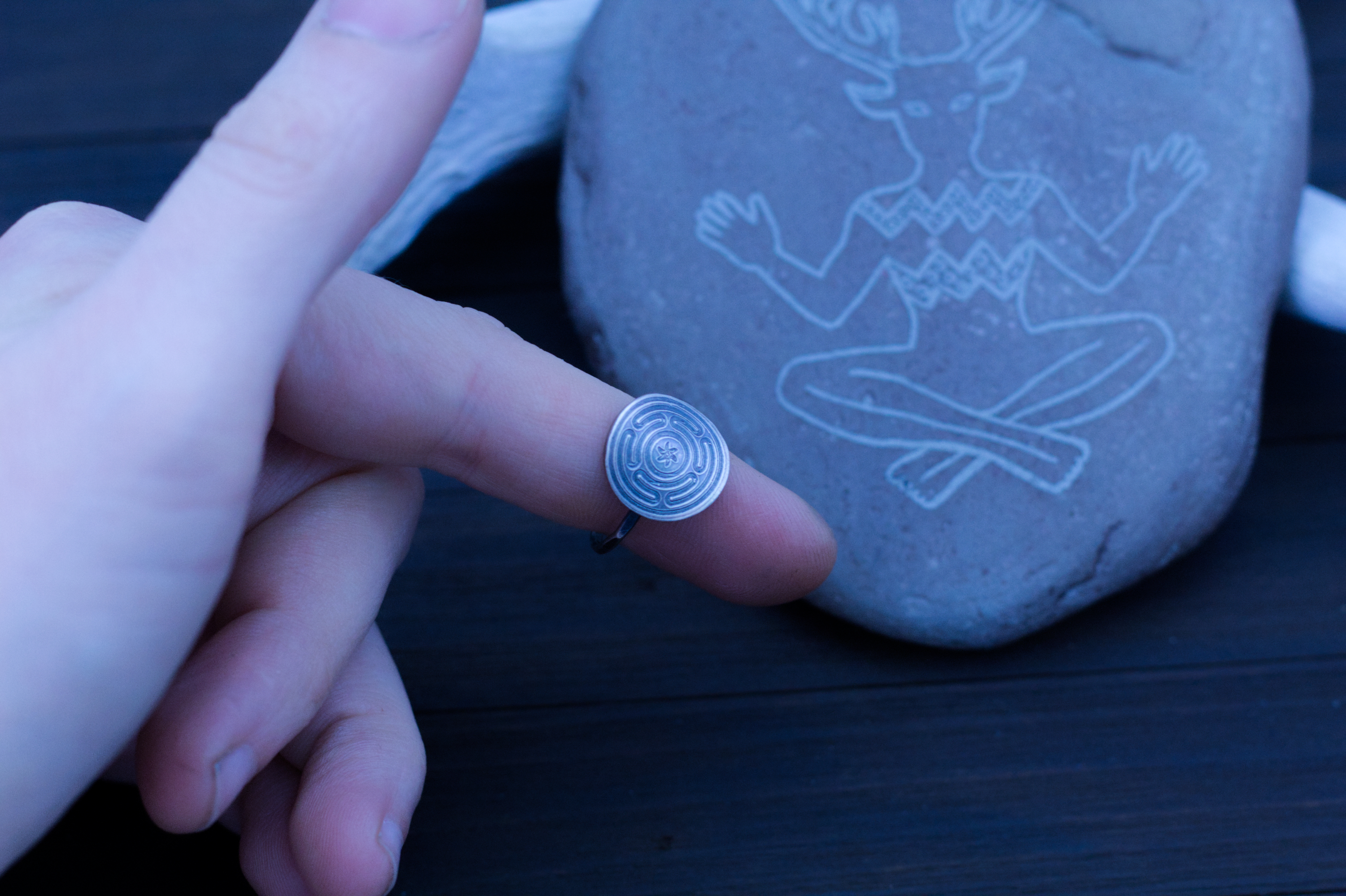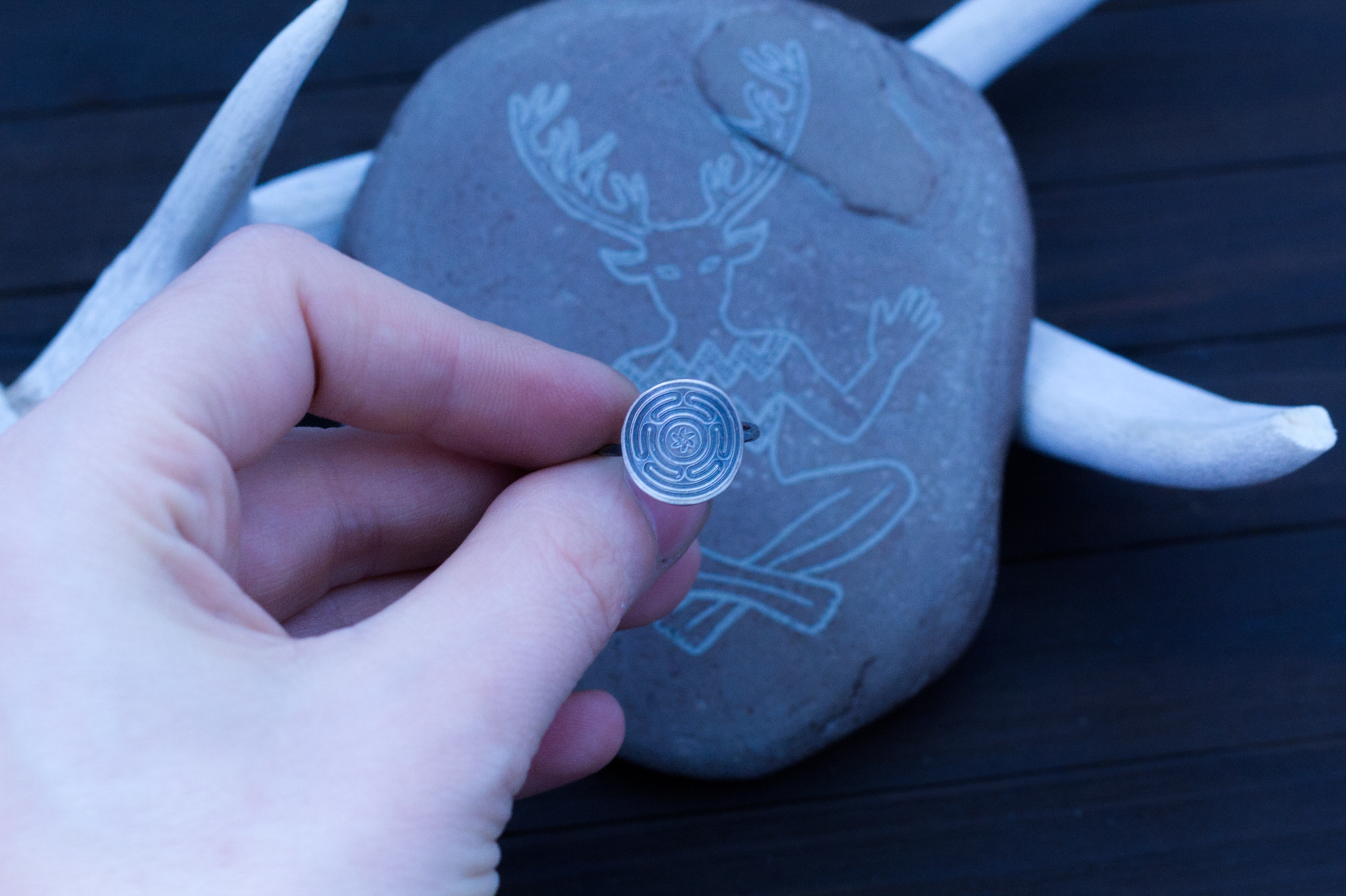This ring is fully handcrafted in your choice of either fine silver, copper or brass on a sterling silver ring base. Hecate’s Wheel itself features a slight curve for comfort and better forming to the finger.