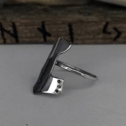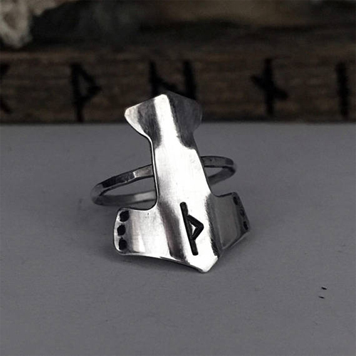 A tiny Mjolnir is crafted in your choice of metal and then stamped with your favorite Elder Futhark Rune – shown is Thurisaz. The hammer rests on a sterling silver band and has a very high polished shine.