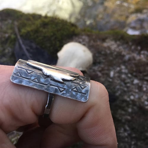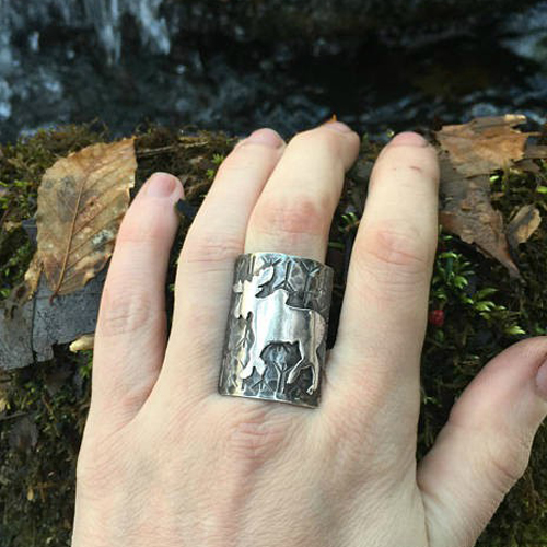 This Moose ring is crafted entirely by hand in fine silver, the Moose silhouette rests atop a tribal Runic background of your choice. Elder Futhark Rune Algiz is pictured.
