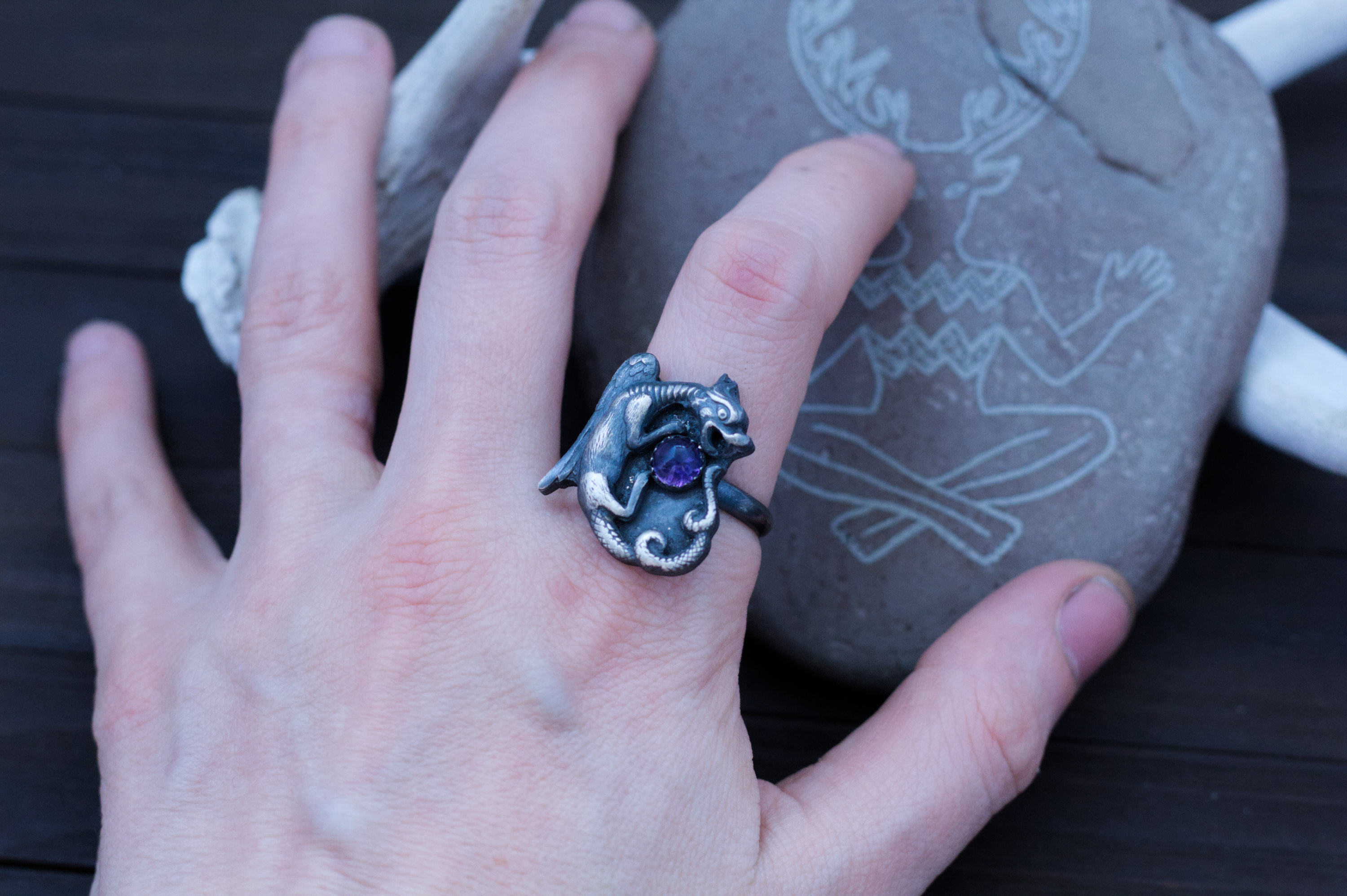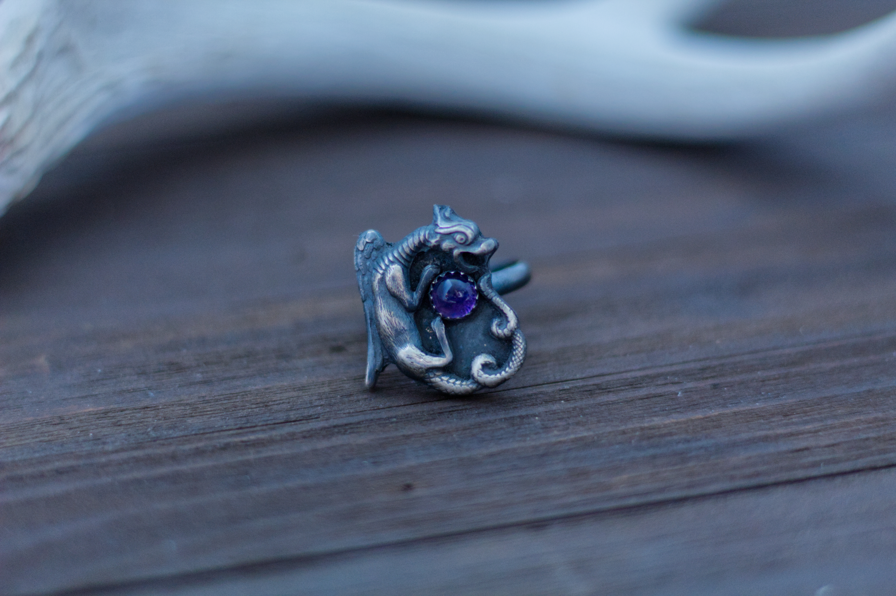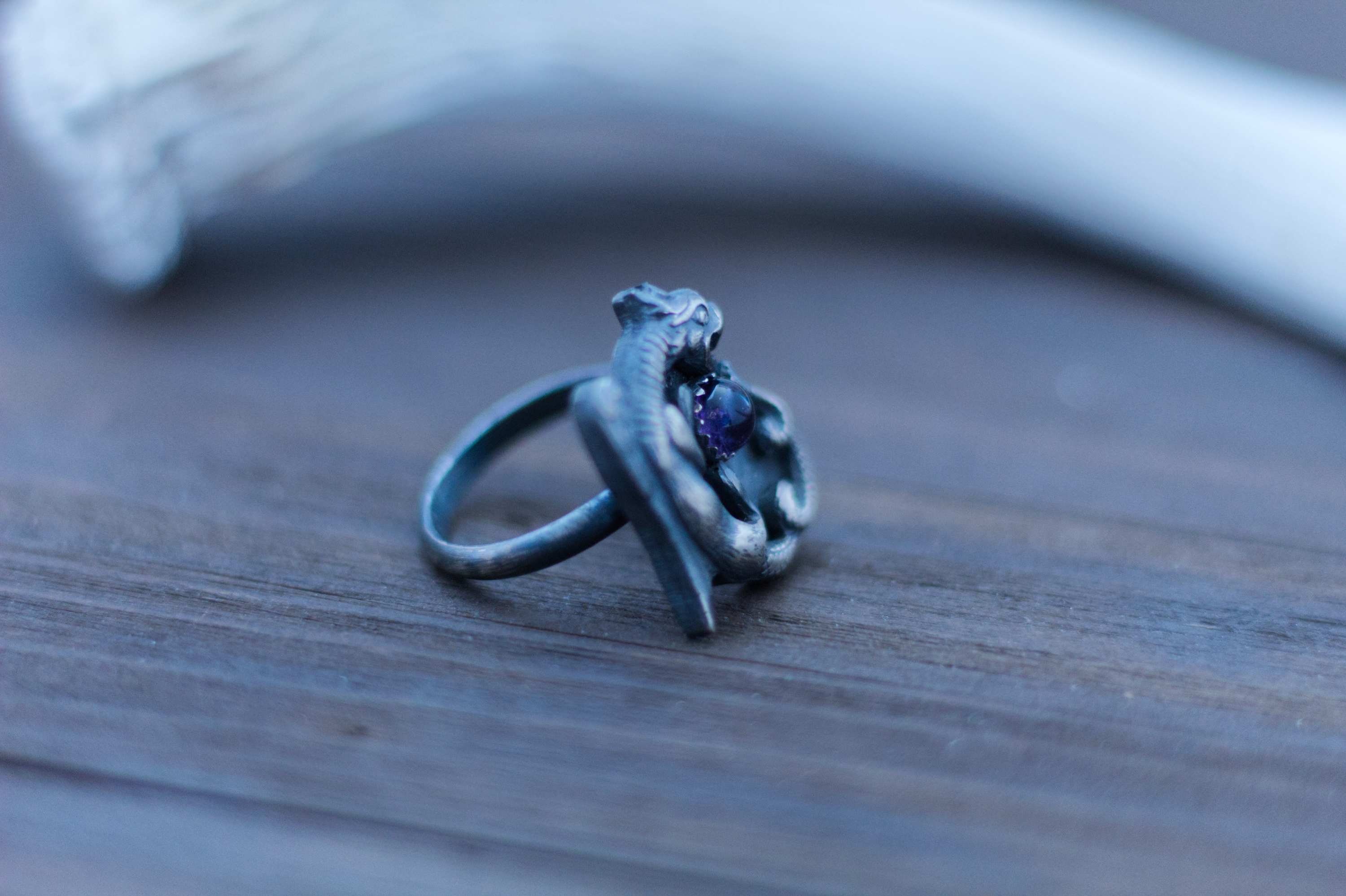 An evocative take on the traditional Ouroboros serpent eating its tail. Fully handcrafted to order (not cast) in solid fine silver with a sterling silver ring base and a rustic, blackened finish with a round 6mm amethyst cabochon.