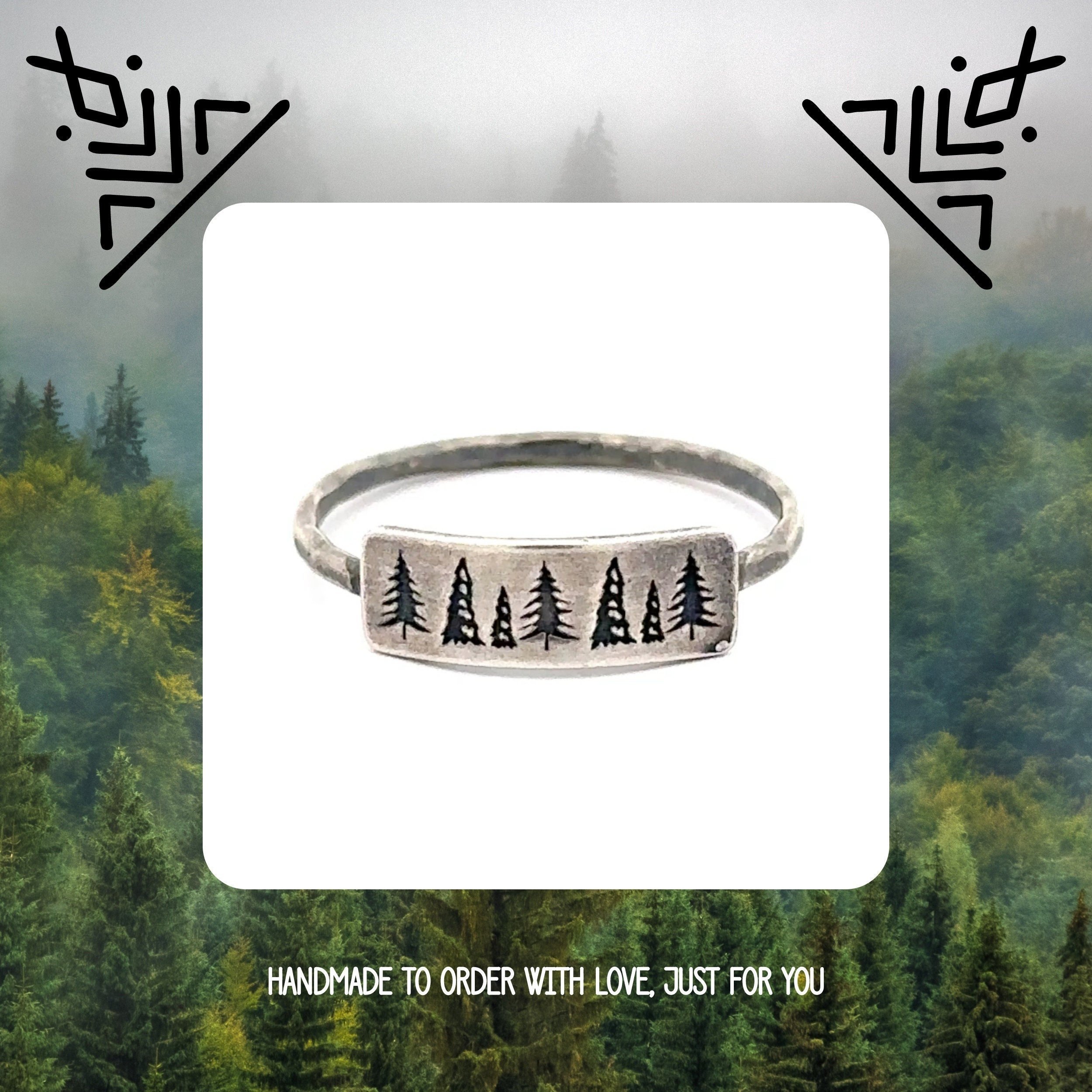 Dainty and minimal, my smallest pine / fir / evergreen tree ring yet. Fully handcrafted in fine and sterling silver. Features a slight curve for comfort and better forming to the finger.
