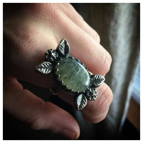 What a beautiful way to celebrate springtime with a gorgeous Prehnite Rutile that is captured in a dagger style bezel setting and adorned with solid fine silver handcrafted leaves and flowers. On the bottom of the ring are two Runes: Ansuz and Mannaz, along with a fine silver hallmark stamp.