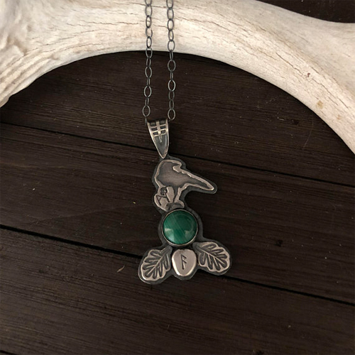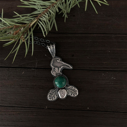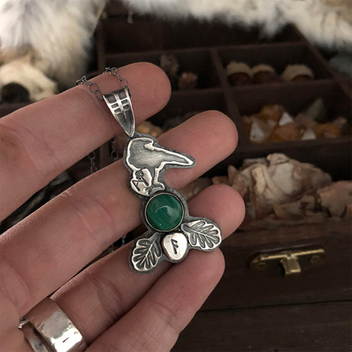 This fully handcrafted (not cast) Muninn, Raven pendant is fabricated in solid fine silver, weighing over 11 grams. This is a gorgeous and enigmatic statement piece worthy of passing down through your family generations. The rustic, blackened finish really brings out the depth and character of the piece. Featuring two oak leaves with the Ansuz Rune in the center along with Muninn holding the Mannaz Rune. Rests on a 18″ blackened sterling silver chain. Choose from either: moss agate or malachite cabochon.