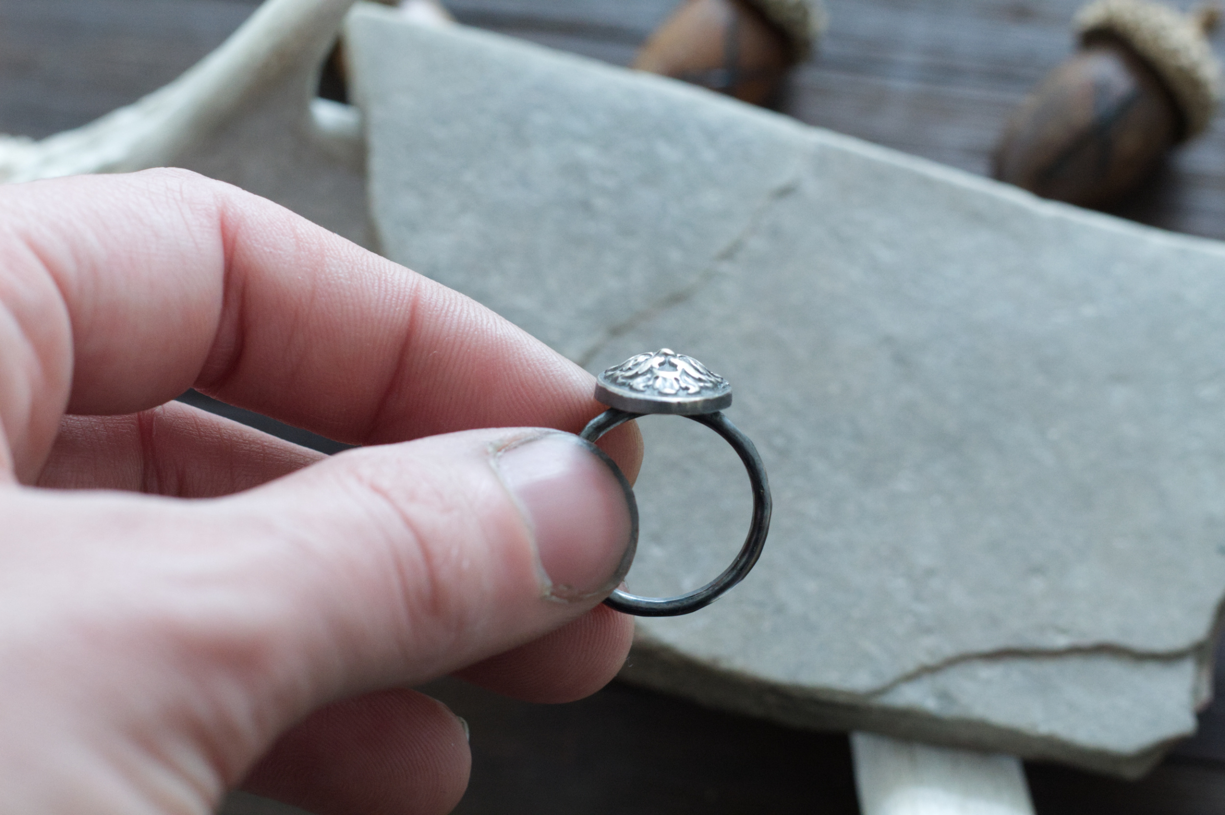 This silver Greenman ring is hand forged in solid fine silver and given a blackened finish. Perfect for the Green Witch or nature lover